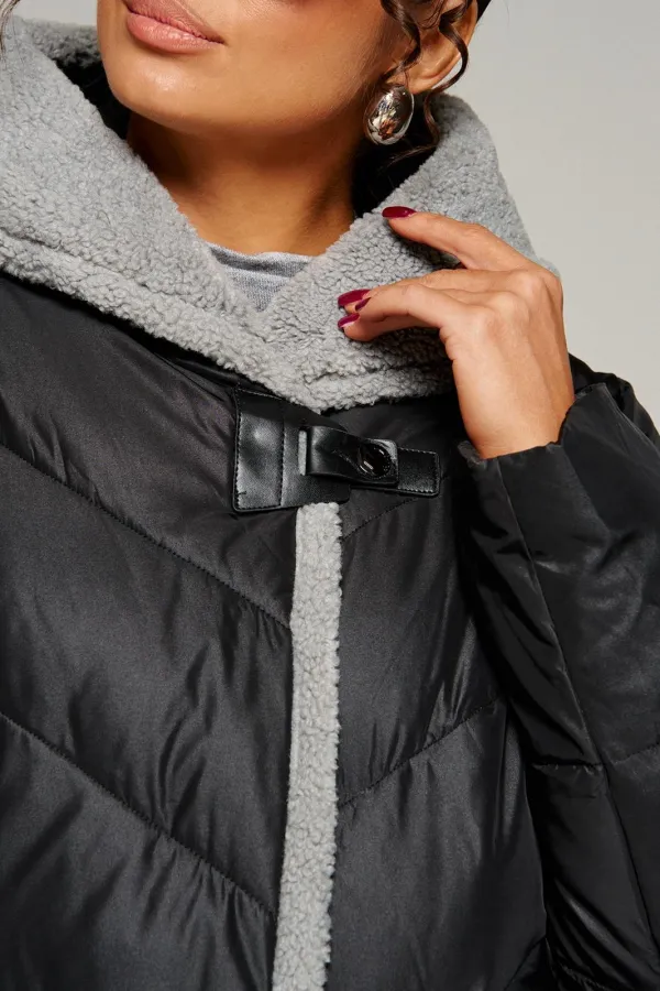 Застежка центральная на двустороннюю молнию от верха до низа и кнопки. Под капюшоном спереди настрочен дополнительный элемент застежки из экокожи.