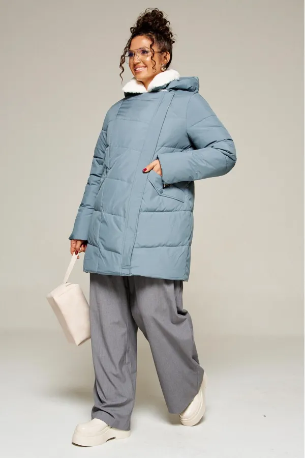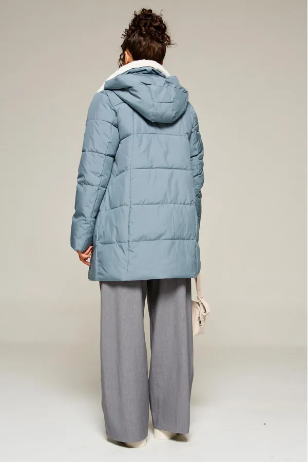 Воротник пиджачного типа с возможностью застегивания до верха. Внутренняя часть воротника и лацканы обработаны искусственным мехом.