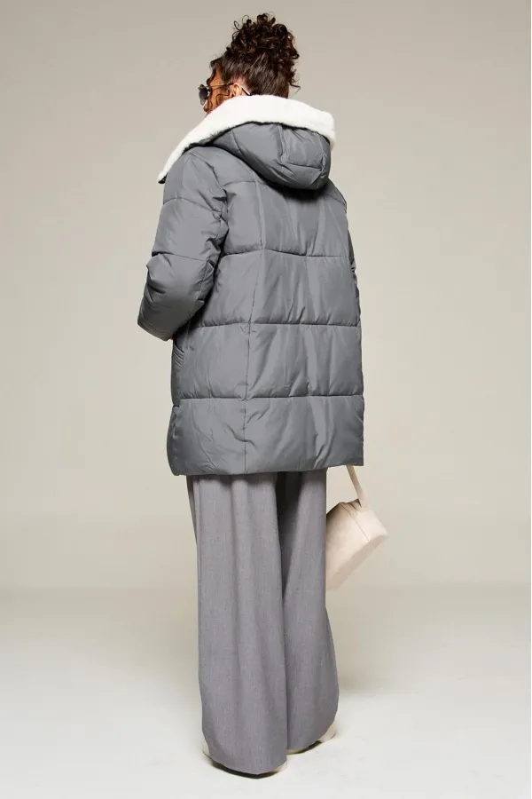 Капюшон с застежкой спереди умеренного объема. По периметру капюшона с внутренней стороны выполнена оторочка из искусственного меха, которая выполняет декоративную и защитную функции, создавая дополнительное тепло и защиту от ветра и холода.