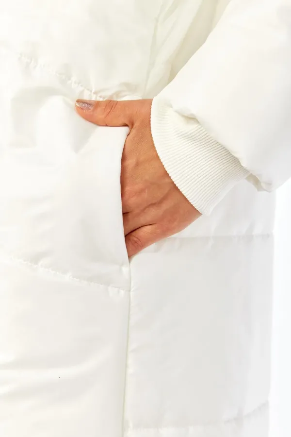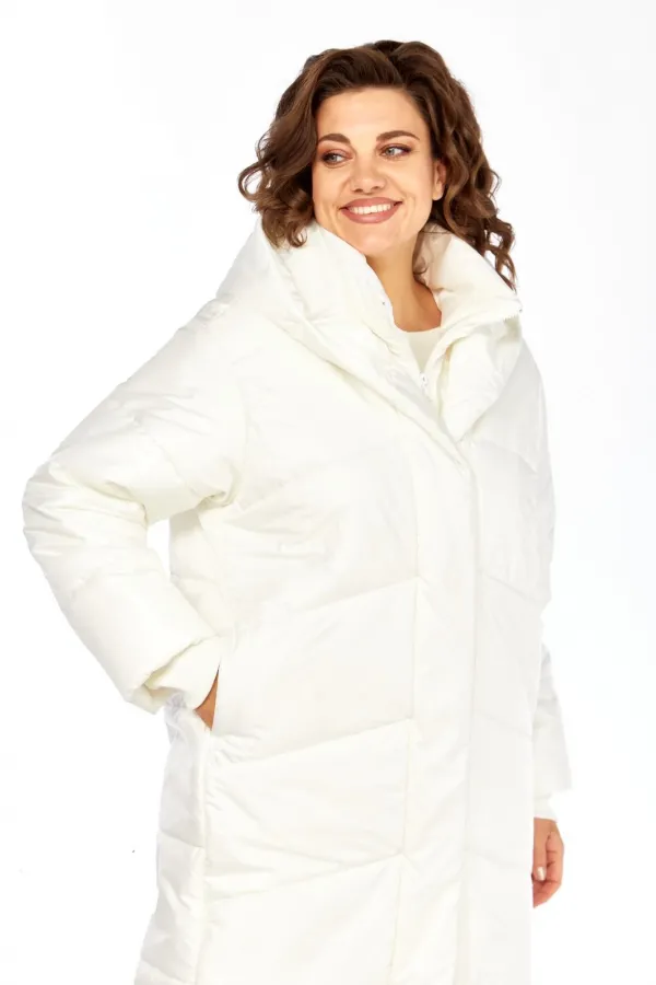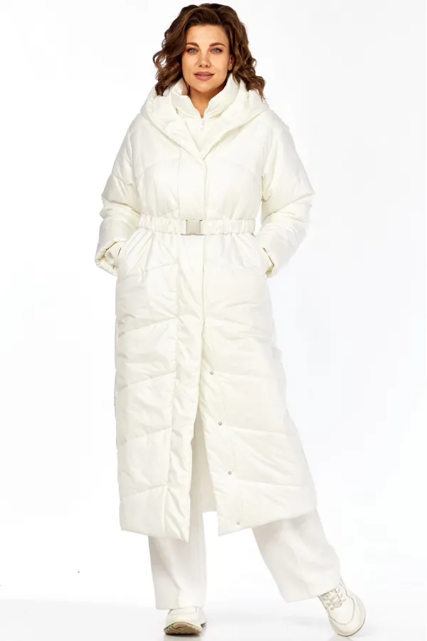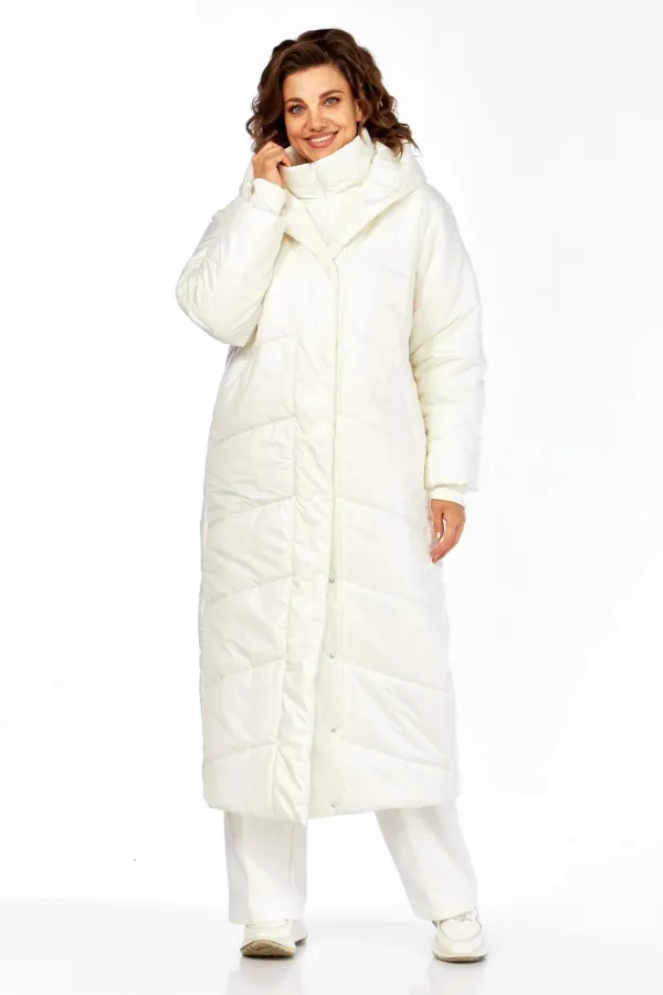 Пальто женское утепленное (длиной до щиколотки). Спинка с горизонтальной стежкой. Боковые швы смещены на перед. Полочки выстеганы по косой. Боковые карманы обработаны в швах. Рукав втачной, одношовный с трикотажными манжетами из-под подгибки. Паьлто с притачной манишкой, которая с воротником-стойкой и на молнии. Капюшон соединен с планкой, которая застегивается на кнопки сверху до низа изделия. Температурный режим до -10 градусов.