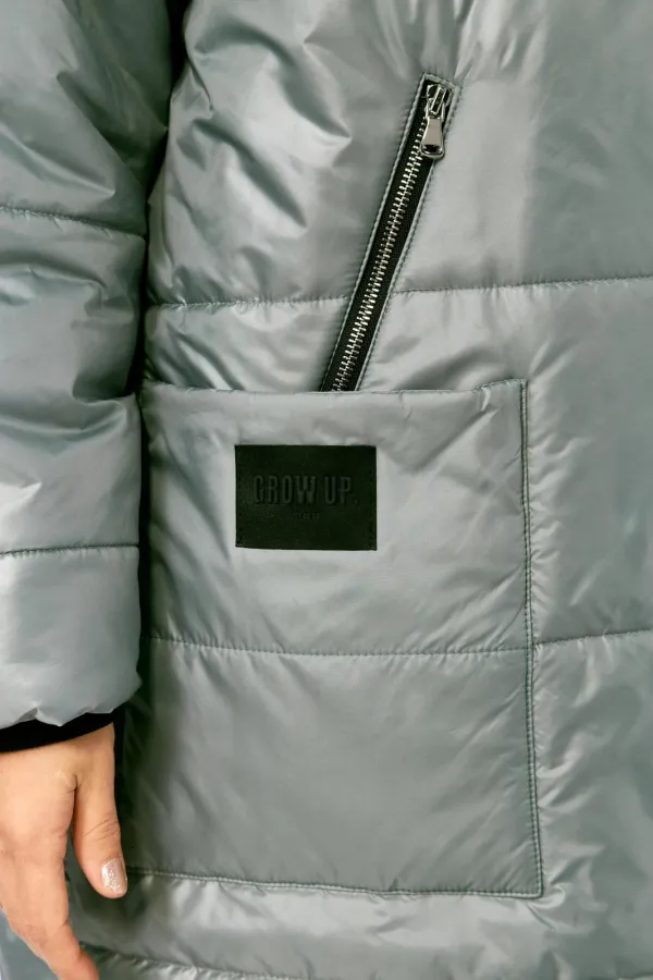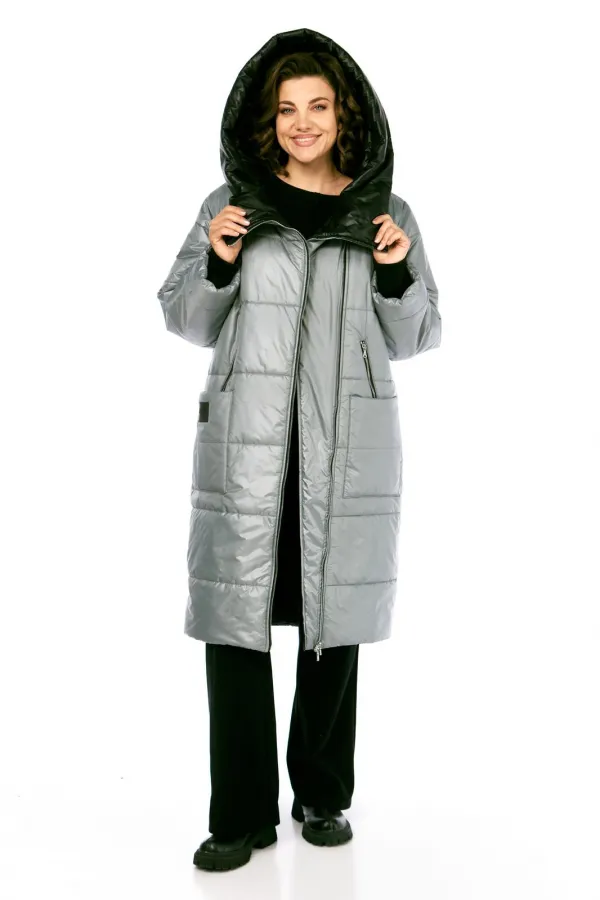 Пальто женское утепленное свободного кроя с ассиметричной застежкой на молнию. Перед с прорезными карманами с молнией и накладными карманами. Правый накладной карман с отделочной нашивкой. Рукав втачной одношовный с трикотажным манжетом выходящим из-под подгибки. Объмный капюшон выполнен из 2-ух видов ткани. Утеплитель Hoopon 200, температурный режим до -10 градусов.