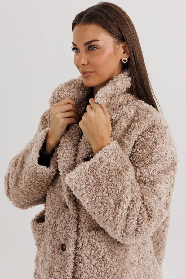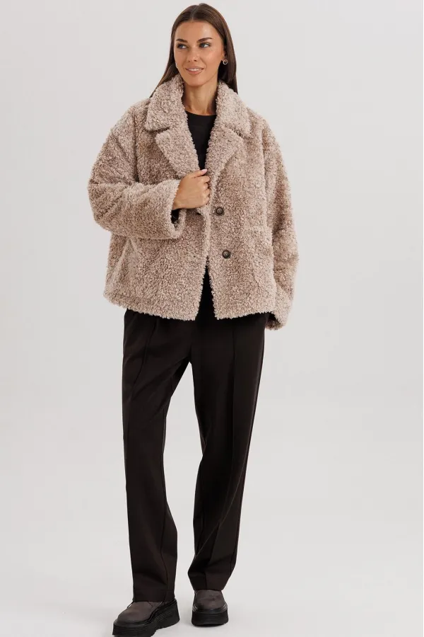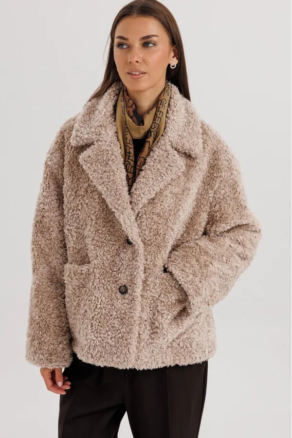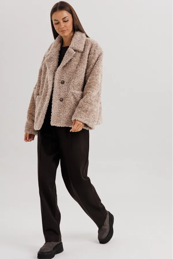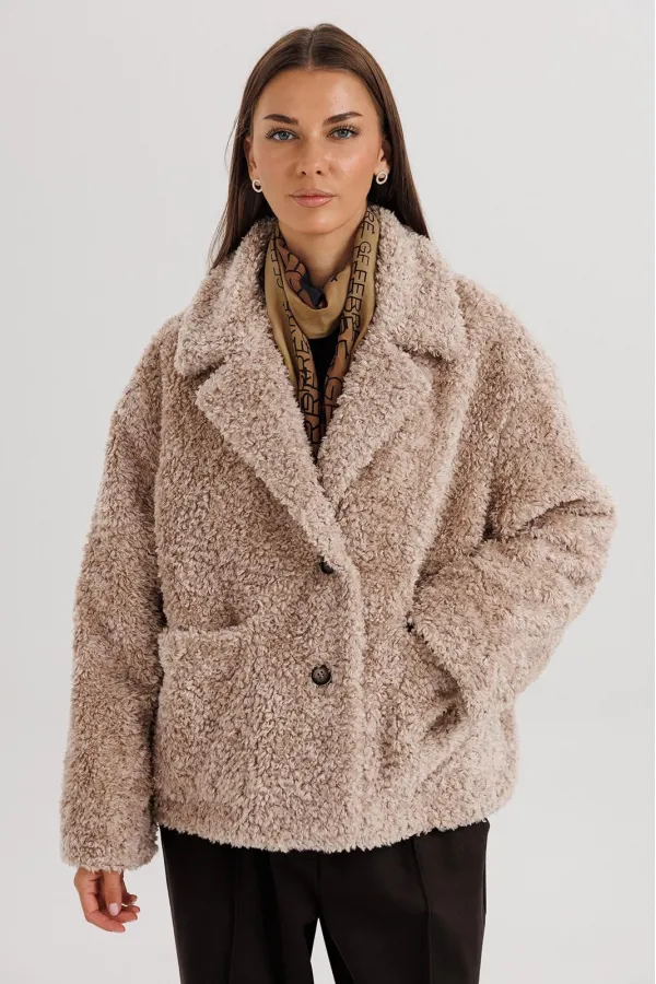 Модель выполнена с однобортной застёжкой на пуговицы, широким отложным воротником и удобными накладными карманами. Универсальный бежевый оттенок легко сочетается с различными элементами гардероба: будь то классические брюки, джинсы или романтичные платья.