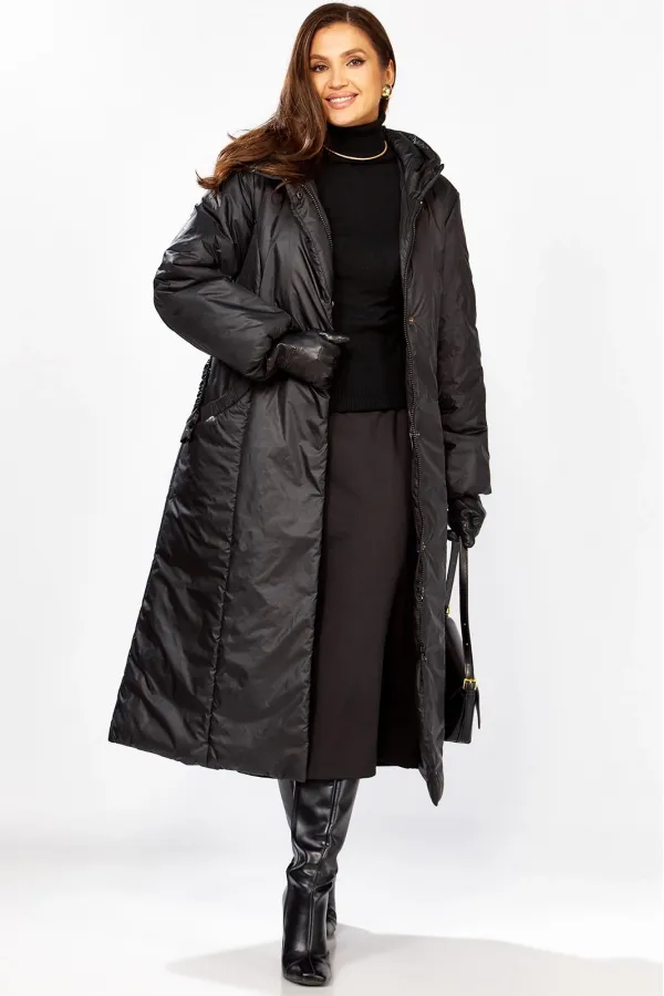 Зимнее стеганое пальто из ткани лакке - союз блеска и практичности. Элегантное, стильное, сочетающее себе комфорт и удобство. А-образный крой мягко формирует линию силуэта, создавая женственный и утончённый образ.