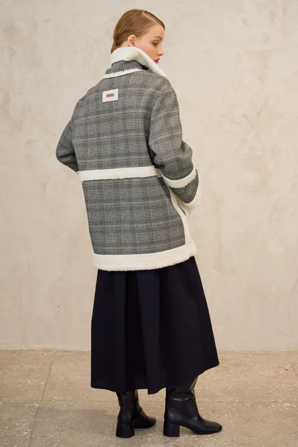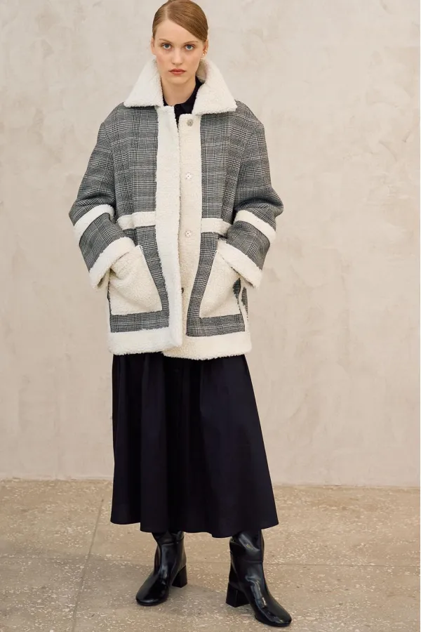 Полупальто свободного кроя. Линия плеча спущена, рукав длинный с отложной манжетой в области рукава подрез. Воротник рубашечного типа, отложной. Застежка центральная на потайные кнопки. Отделочная ткань по борту и низу изделия, по бокам накладные карманы.ПРЕДЗАКАЗ на 10.10.2025