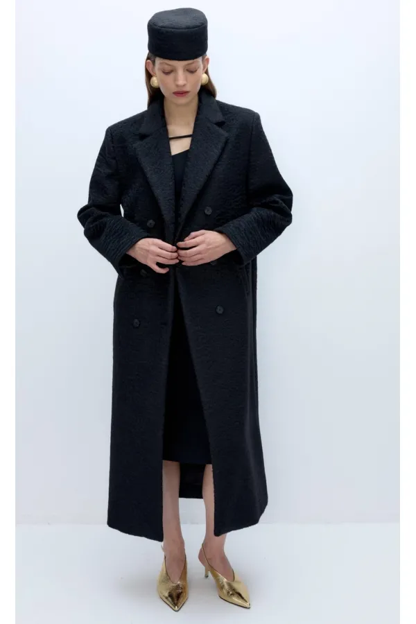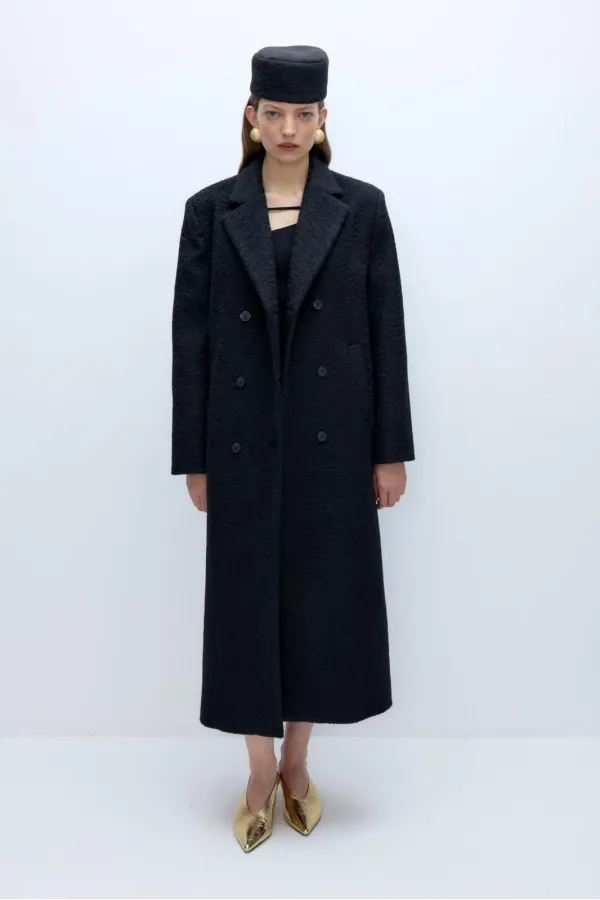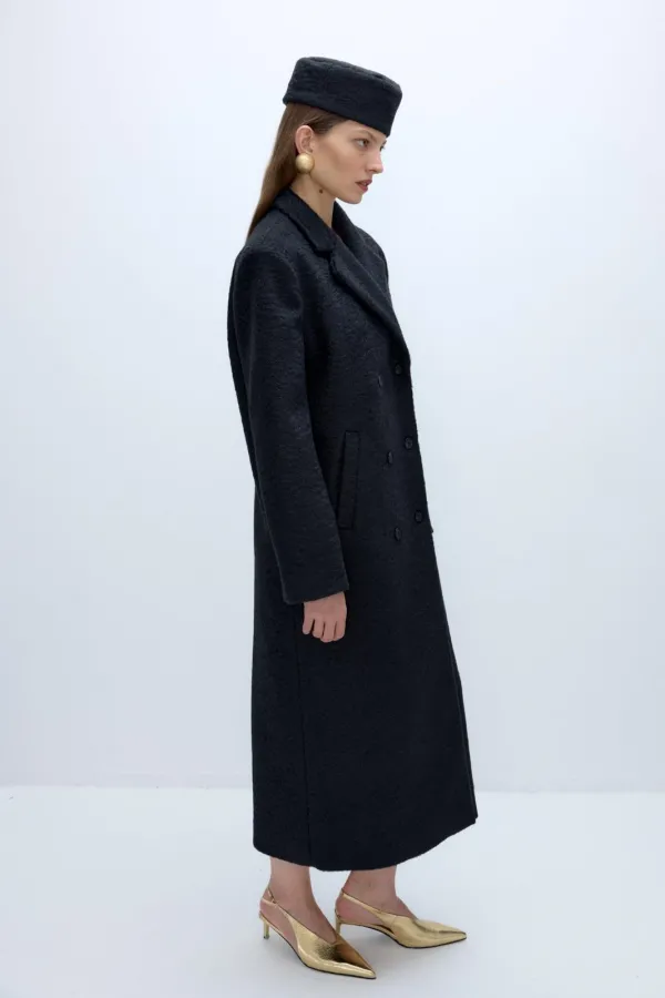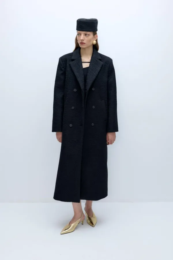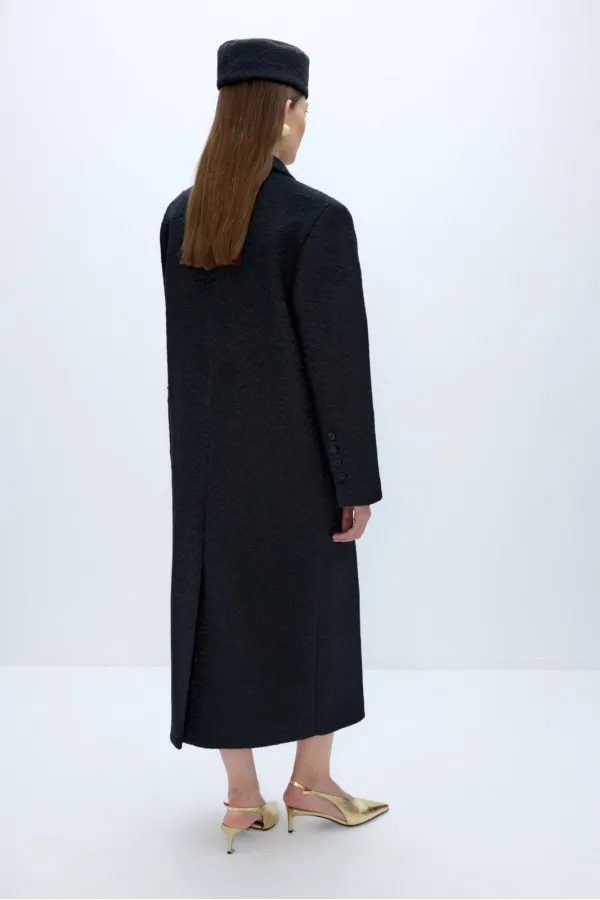 Детали: прямой силуэт, свободный покрой, пиджачный воротник, двубортная застежка на петли и пуговицы, рукава втачные со шлицей, функциональные карманы, спинка со средним швом и высокой шлицей, пальто на подкладке.