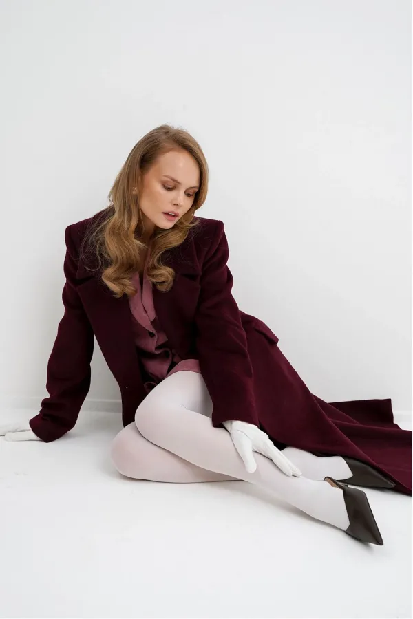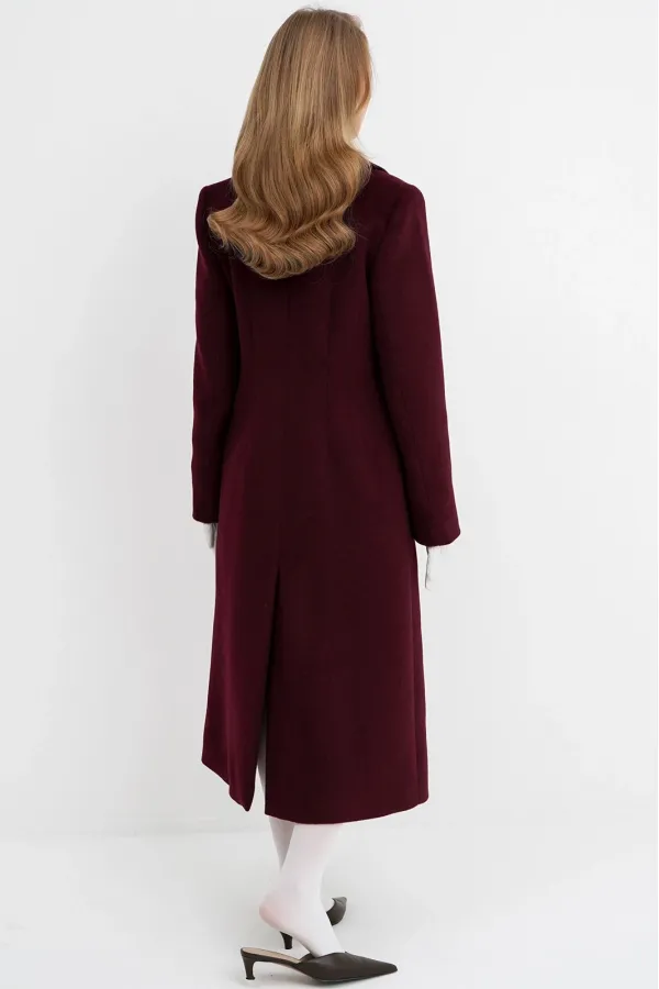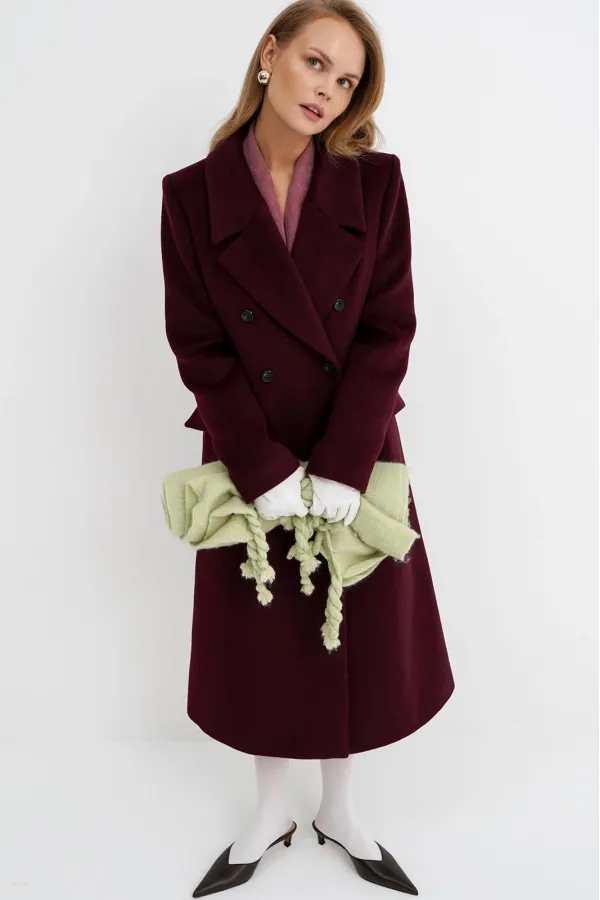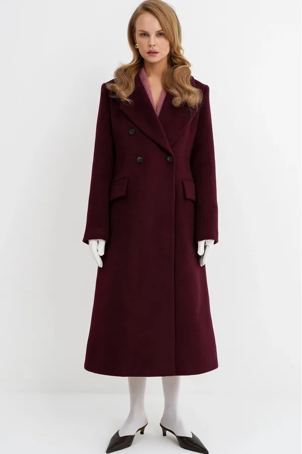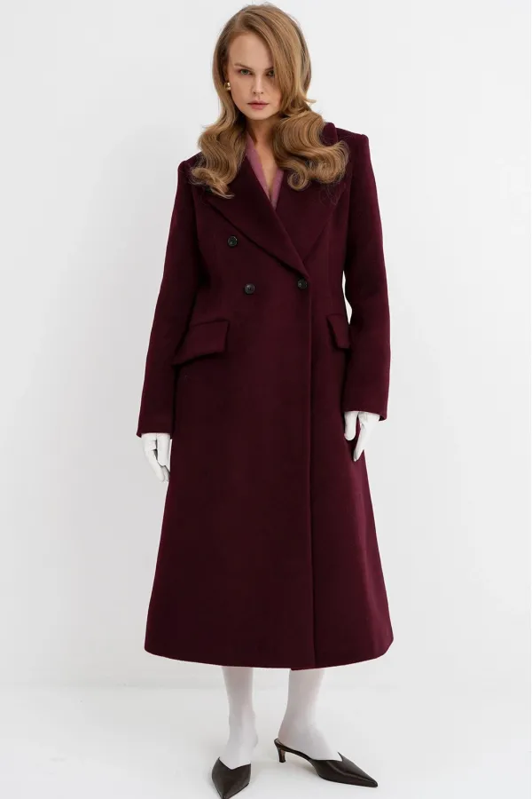Двубортное приталенное пальто X- силуэта. Детали: полуприлегающий силуэт, перед с прорезными карманами с клапанами, перед и спинка с талиевыми вытачками, спинка со средним швом и шлицей, застежка на петли и декоративные пуговицы, втачные длинные рукава, пальто на подкладке.