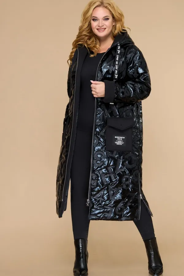 Пальто женское, прямого силуэта, со спущенной плечевой линией. По переду с накладными карманами с клапанами, которые застёгиваются на петлю и пуговицу, с центральной застёжкой на тесьму молнию. Рукав втачной, длинный, с отложной манжетой. По горловине капюшон с кулисой и декоративной тесьмой. В боковых швах разрезы с тесьмой молнией.