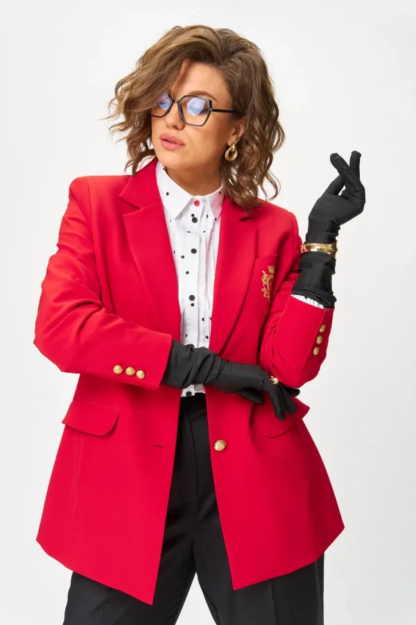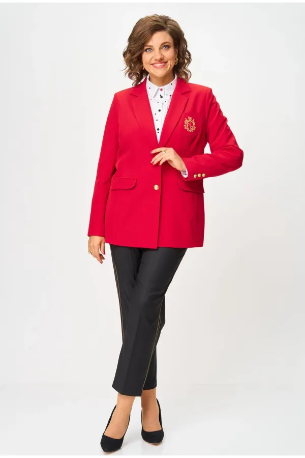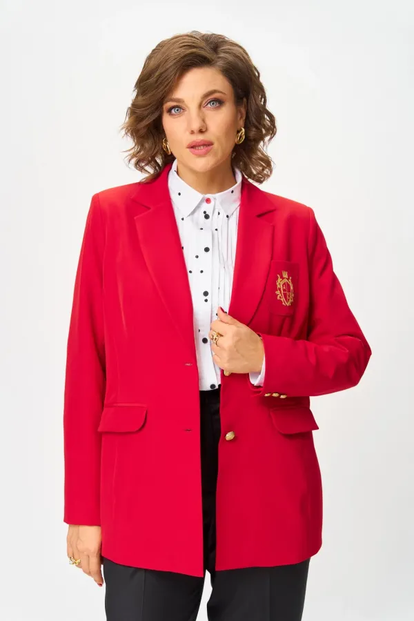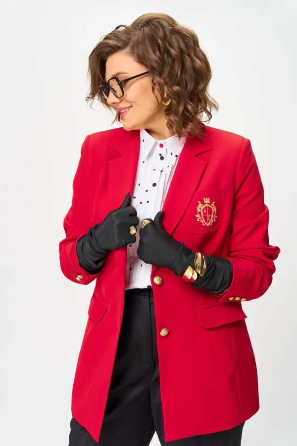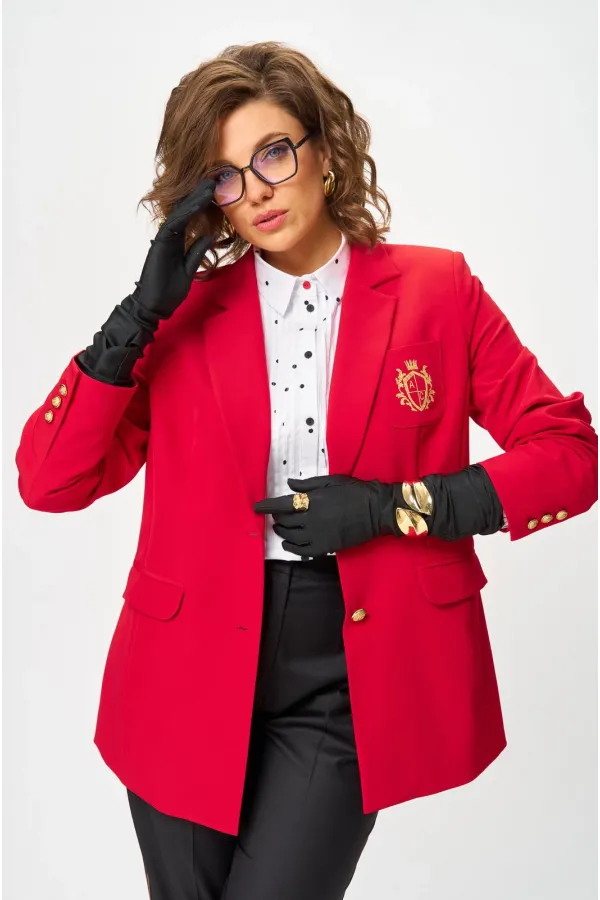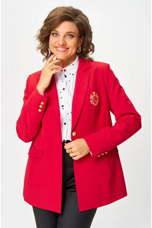 Прекрасный, стильный, яркий женский жакет не оставит равнодушной ни одну модницу! Полуприлегающий классический покрой подчеркнет достоинства фигуры, он идеально подойдет для создания разнообразных нарядов на каждый день благодаря универсальности и стильному дизайну. Жакет с застёжкой спереди на петли и пуговицы, с пиджачным воротником и втачными двухшовными рукавами. По переду выполнены боковые прорезные карманы с клапанами и нагрудный накладной карман с дизайнерской фирменной вышивкой, спинка со швами.