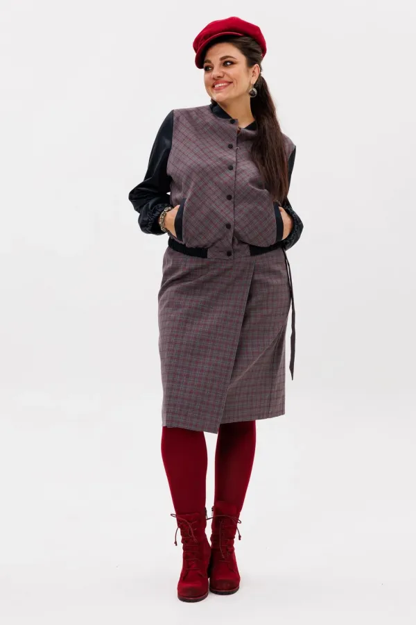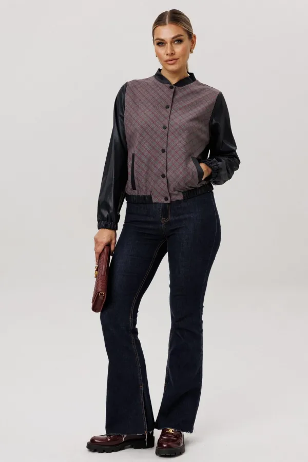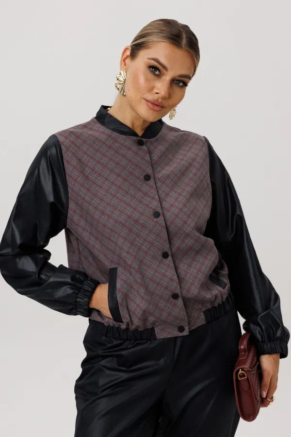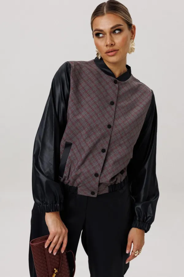 Бомбер выполнен из костюмной ткани в сочетании с тканью с напылением под кожу. Силуэт прямой, с застежкой на кнопки по всей длине.