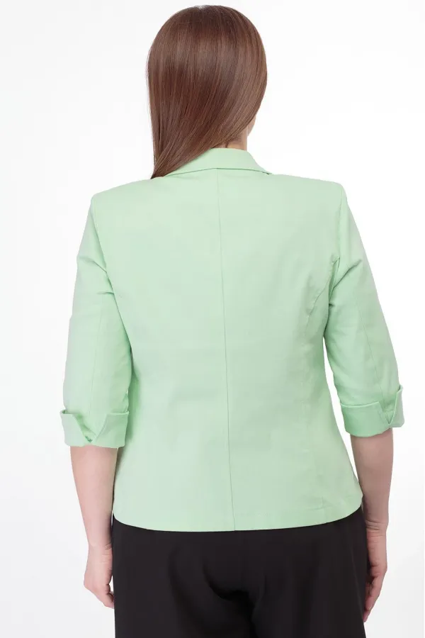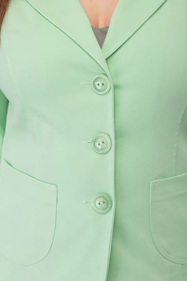 Полуприлегающий силуэт жакета со стройными рельефами, отложной воротник с бортами. Центральная застежка на пуговицы. Накладные карманы. Втачной рукав 3/4 длины с отворотом. Спинка с рельефами и средним швом.