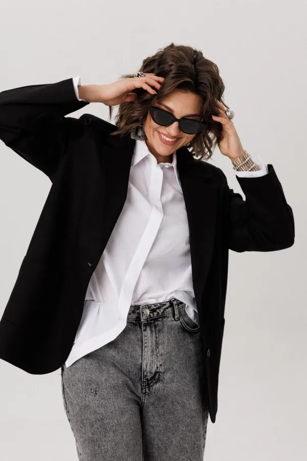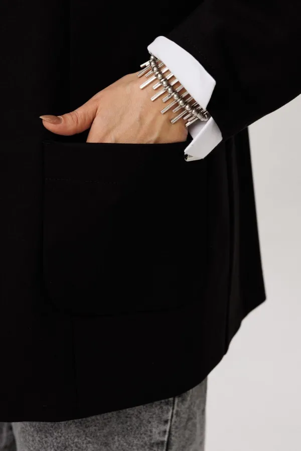 Классика с дерзким характером — этот жакет сочетает в себе строгий крой и неформальную изюминку. Прямой силуэт с однобортной застёжкой на пуговицы и пиджачным воротником с лацканами создаёт элегантную основу.