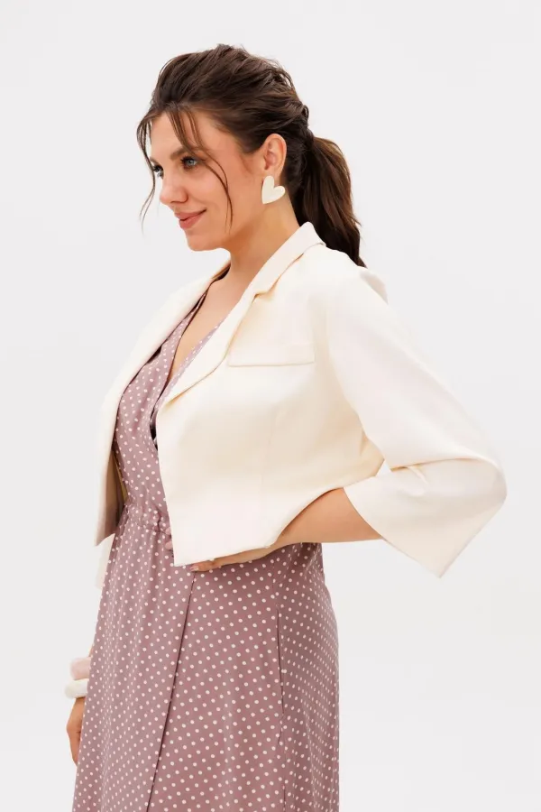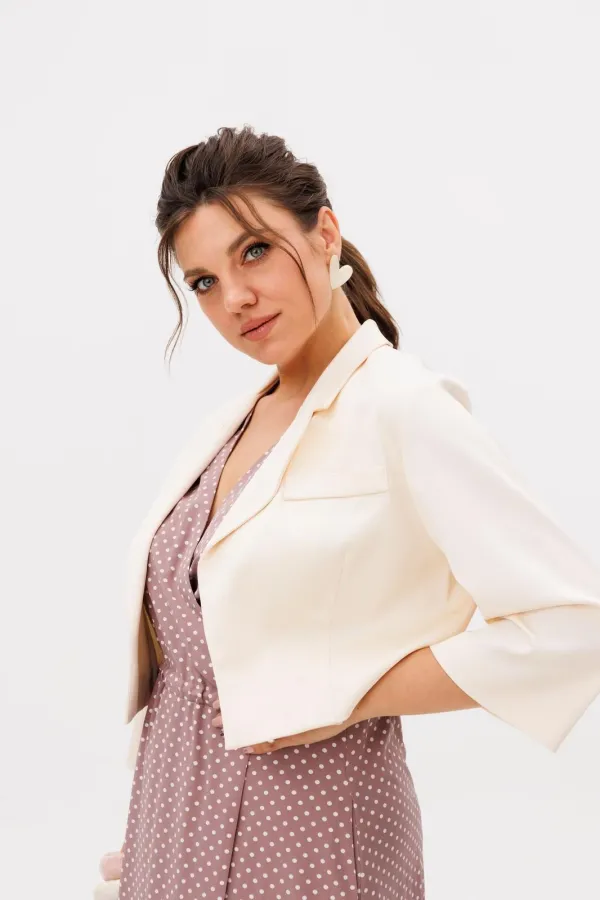 Укороченный силуэт деликатно подчеркивает линию талии, создавая гармоничные пропорции и лёгкость в образе. Рукава длиной 3/4 открывают запястья, добавляя изящества и делая модель комфортной для тёплого сезона. Лаконичный дизайн дополнен аккуратной декоративной листочкой, которая становится ненавязчивым акцентом и подчеркивает продуманность деталей. Жакет легко вписывается в гардероб, красиво сочетаясь как с платьями, так и с базовыми изделиями, создавая современные многослойные образы.