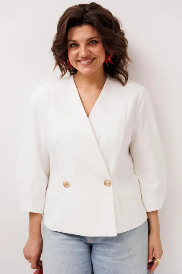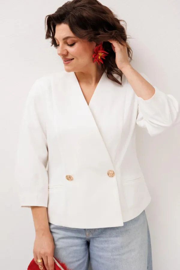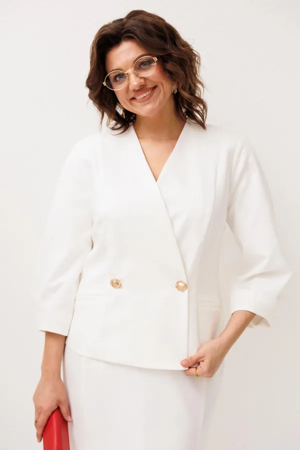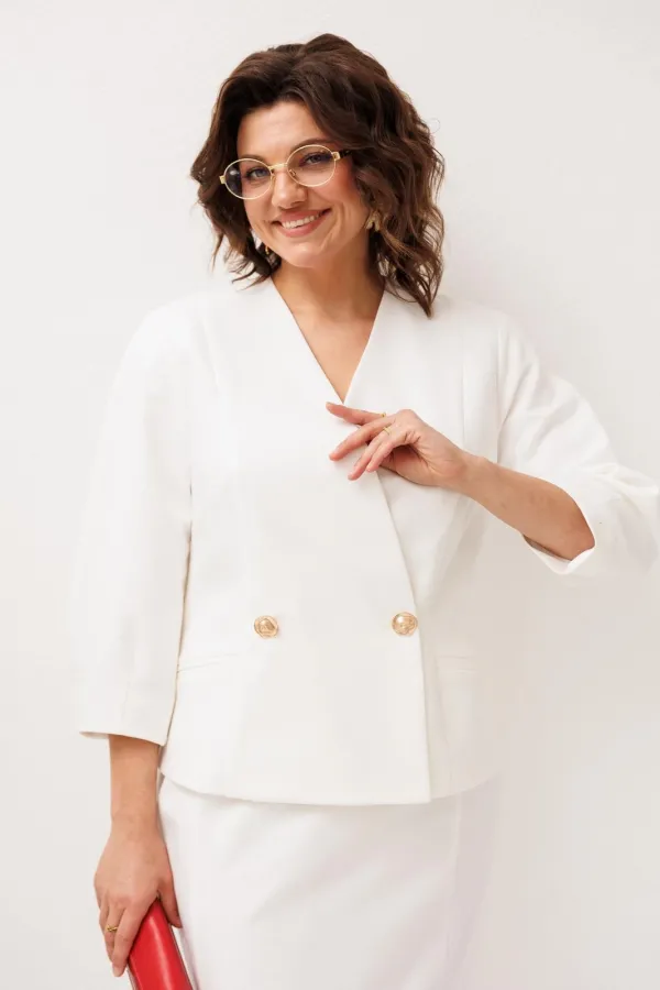 Жакет в нежном оттенке «лебедь» словно наполняет образ лёгкостью и спокойной уверенностью. Полуприлегающий силуэт мягко подчеркивает линии фигуры, создавая аккуратный и женственный образ без излишней строгости, а V-образный вырез добавляет утончённости и визуальной лёгкости. Двубортная застёжка украшена красивенными золотыми пуговицами, которые деликатно притягивают взгляд и придают жакету благородное сияние, делая образ более выразительным и элегантным. Рельефы по спинке и полочке формируют изящную посадку, а прорезные карманы в рамку становятся лаконичным акцентом, подчеркивающим продуманность каждой детали.