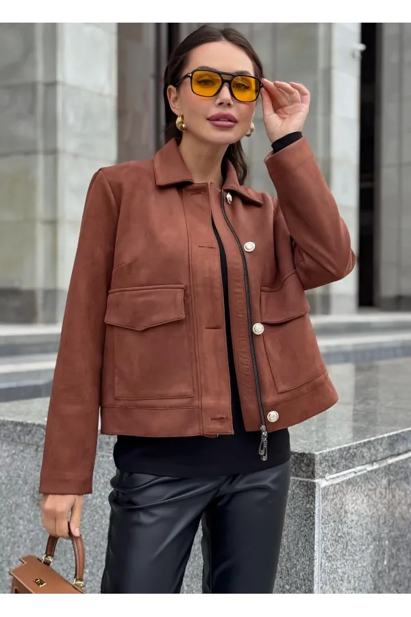 Жакет однобортный, на подкладке, выполнен из эко-замши. Обработан молнией разъёмной молнией по центру переда, закрывающейся планкой с пуговицами. Воротник отложной, рубашечного типа. Рукава втачные, одношовные, прямые. По передним половинкам обработаны накладные карманы с клапаном.