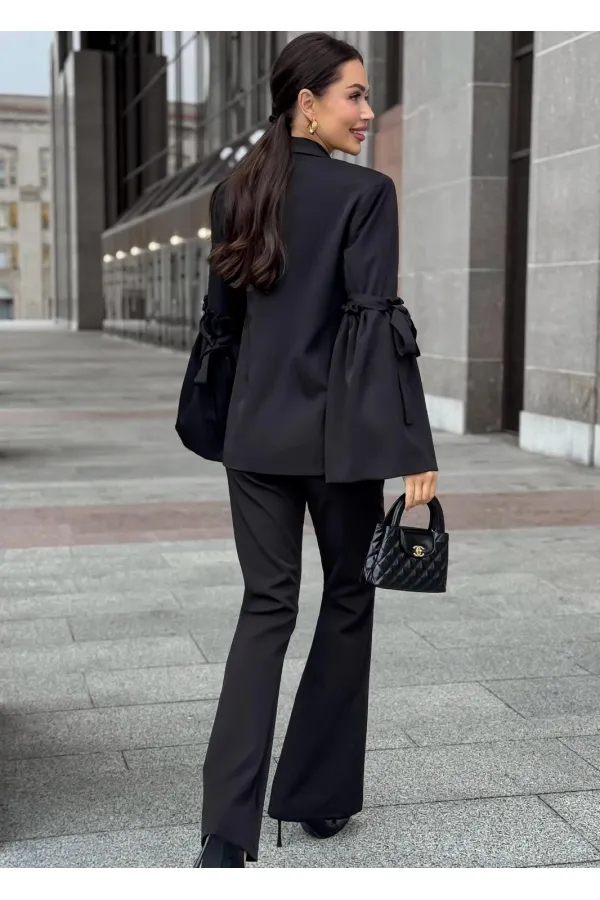 Жакет однобортный свободного силуэта. Жакет обработан подкладкой. Рукав прямой, длинный, втачной, отрезной с пришитой присборенной деталью, шнурком из основной ткани для завязывания.