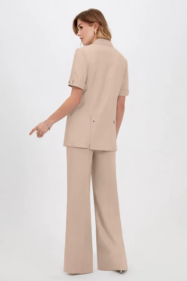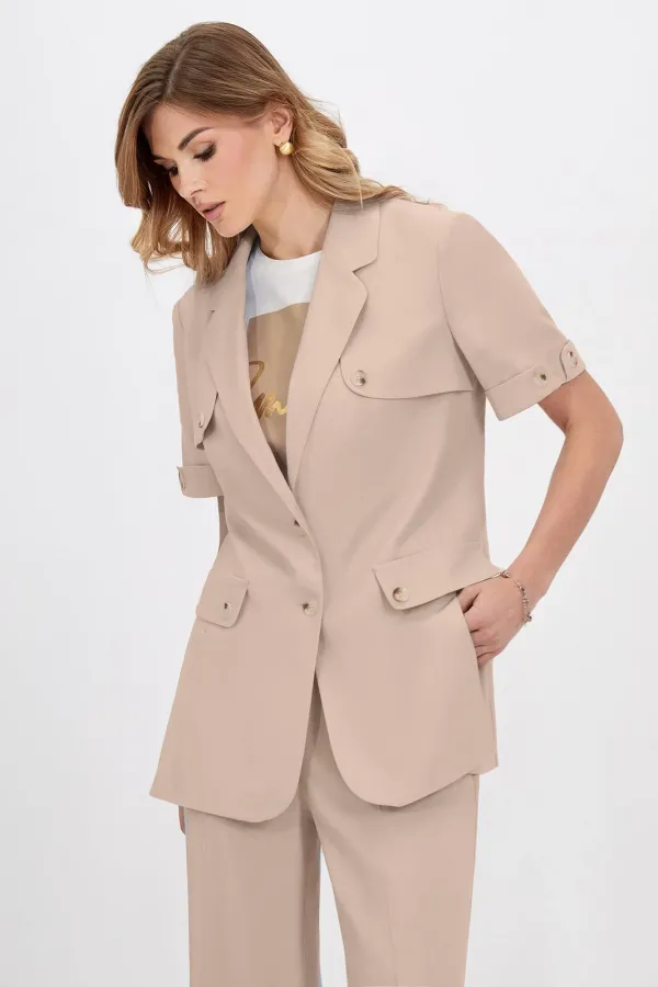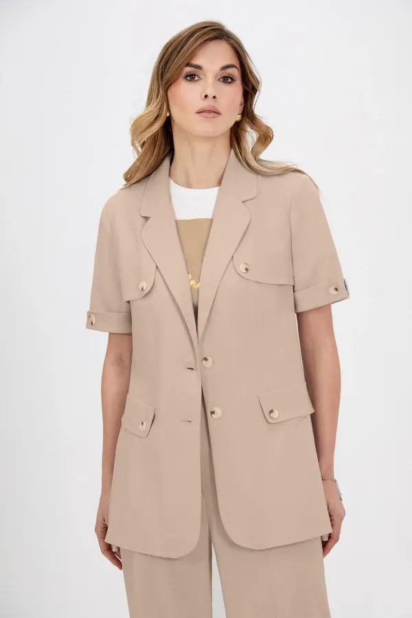 Стильный, элегантный - этот модный жакет с воротником-лацканом, с застёжкой на петли-пуговицы и отделочными клапанами заслуживает вашего внимания. Сочетание пуговиц и отлетные кокетки придают классическим элементам спортивный характер. Шлицы по переду и спинке добавляют лёгкости. Рукава короткие с фигурными манжетами. Смесовый материал на основе льна приятен в носке, а мягкая хлопкавая подкладка обеспечивает комфорт. В пару можно подобрать широкие брюки, вышедшие в той же линейке.