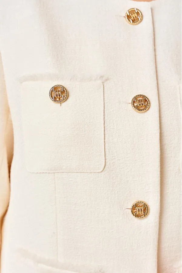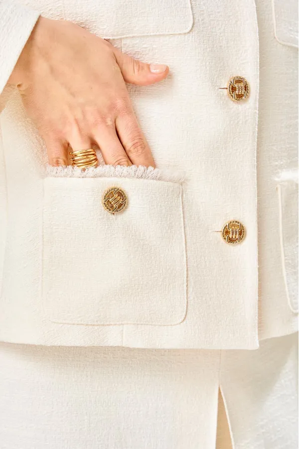 Жакет свободного силуэта, с накладными карманами, по краю карманов тесьма с вытрепанным краем.