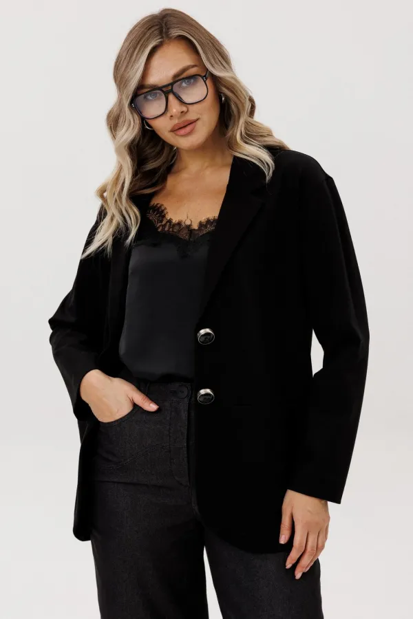 Дополнительное описание: жакет однобортный, без подкладки, со скругленными бортами, спущенными рукавами и накладными карманами.