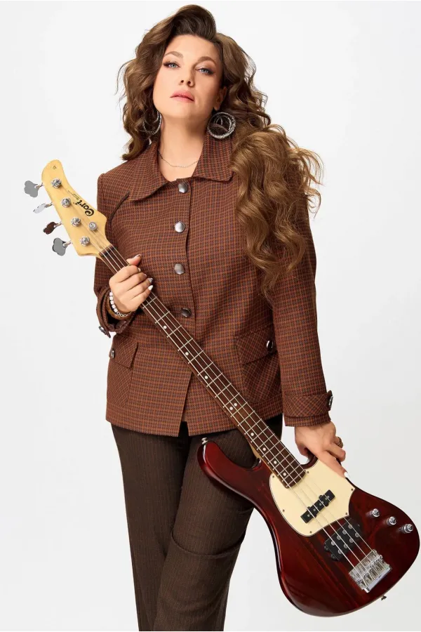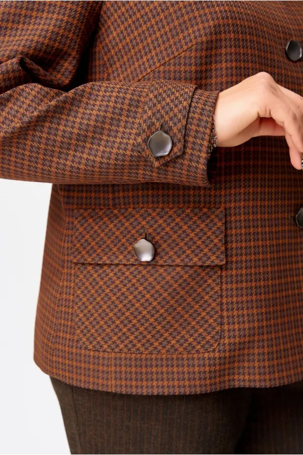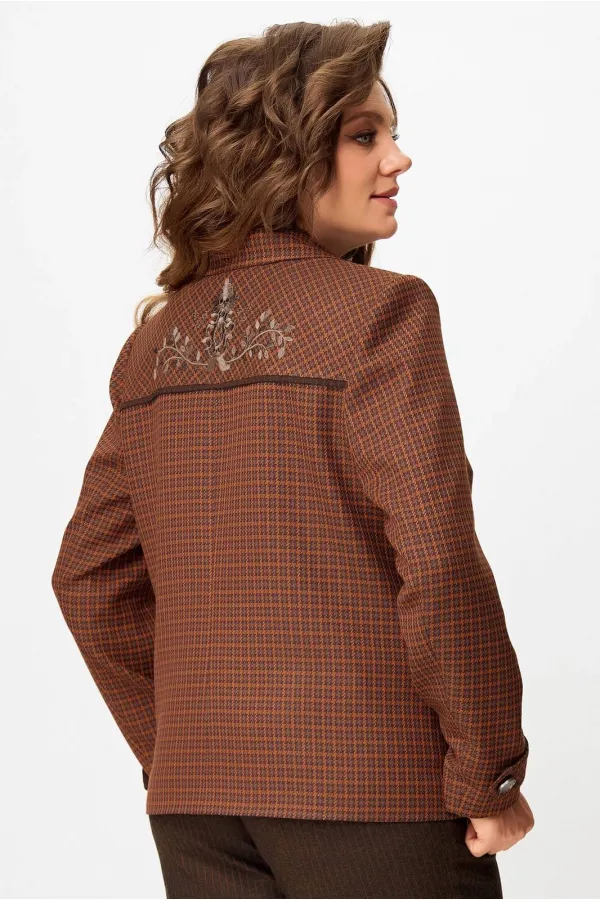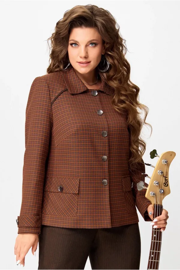 Женский стильный жакет Венциана из клетчатого текстиля, полностью на подкладке, с элегантным полуприлегающим силуэтом. Его дизайн отличает однобортная застежка на пуговицы и классический отложной воротник. Передняя часть изделия искусно оформлена нагрудными вытачками и отрезными бочками, а верхняя часть полочки украшена кокеткой с вшитым декоративным кантом. Функциональные накладные карманы с клапанами также застегиваются на пуговицы. Спинка имеет средний шов и отрезную кокетку сверху, также с декоративным кантом. Двухшовные втачные рукава завершаются декоративными патами на пуговицах.