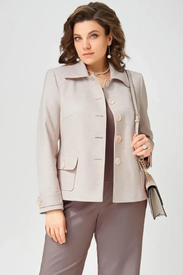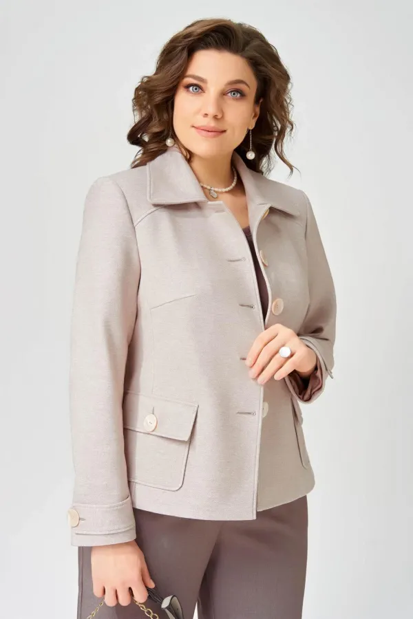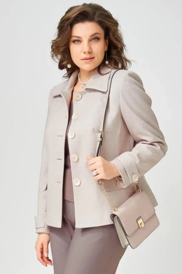 Женский стильный жакет Венциана выполнен из пальтово-костюмной ткани. Жакет на подкладке, полуприлегающего силуэта. Кокетки и накладные карманы с клапанами придают модели архитектурную чёткость. Двухшовные рукава с патами завершают образ с ноткой изысканной строгости.