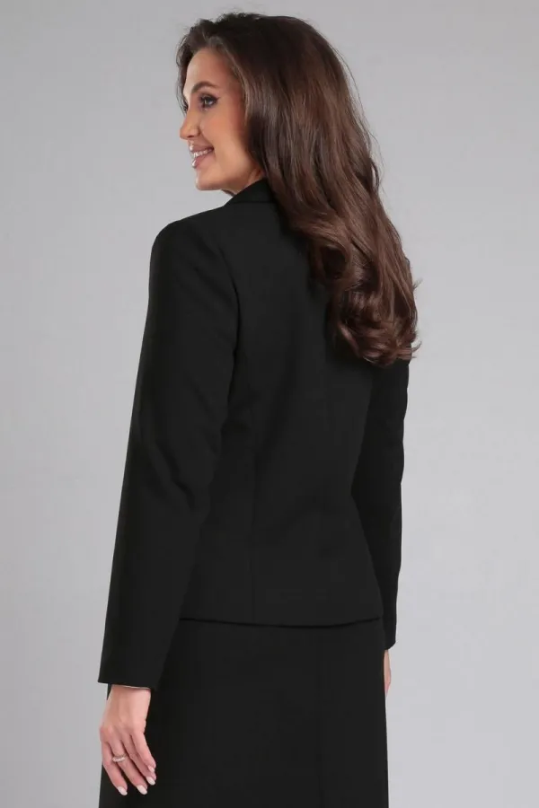 Жакет женский на подкладке, полуприлегающего силуэта. По переду функциональные карманы в рамку с клапаном. Спинка со средним швом и рельефами из проймы. Воротник пиджачного типа с закругленными бортами, застежка на одну пуговицу и петлю. Рукава двухшовные длинный.