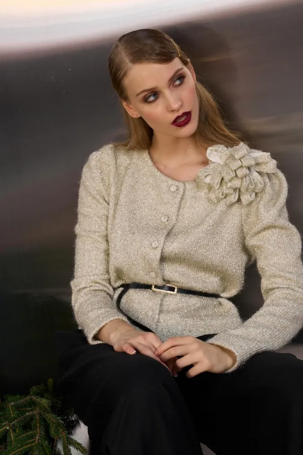 Жакет прямого силуэта и выполнен из нежного трикотажного полотна. Рукав втачной длинный, по верхней части рукава встречная складка. Округлый вырез горловины. Застежка на петли и пуговицы. Брошь-цветок съемная.Длина по спинке от высшей точки горловины: 54 см