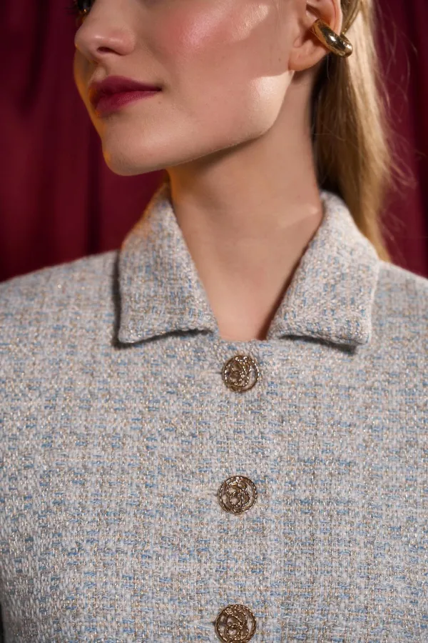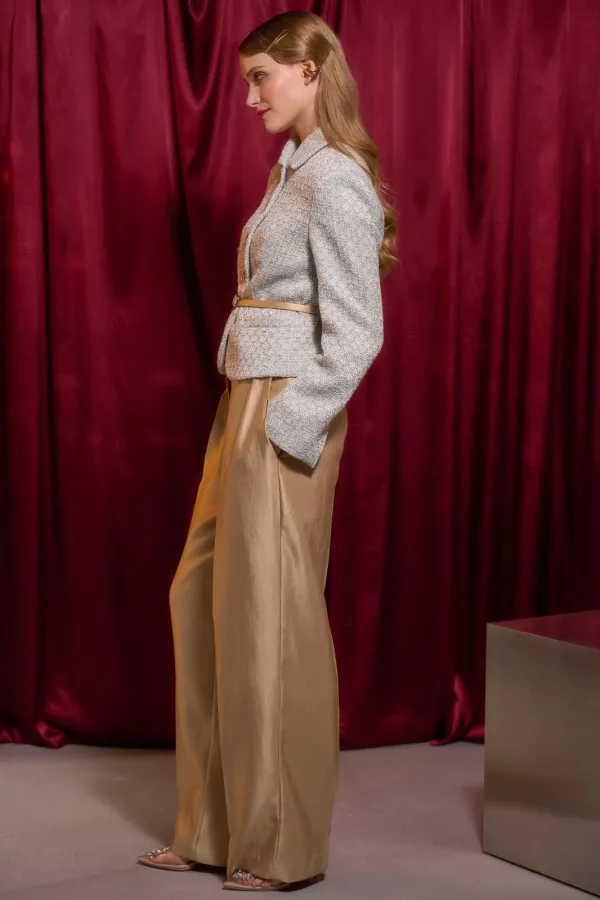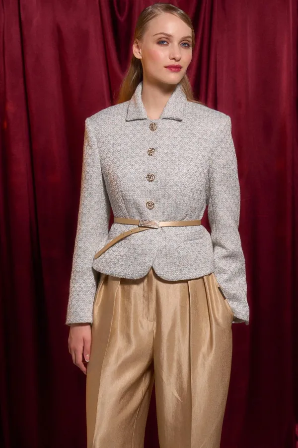 Жакет полуприлегающего силуэта с центральной застежкой на петли и пуговицы. Край борта фигурной формы. Рукав втачной длинный со шлицей. На шлице рукава пуговица. Воротник рубашечного кроя. По спинке средний шов и рельефы.Длина по спинке от высшей точки горловины: 52 см