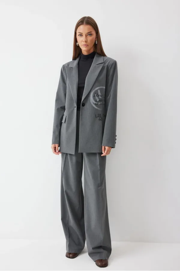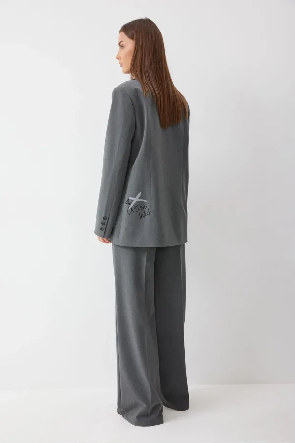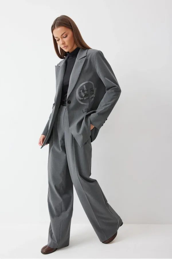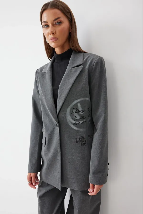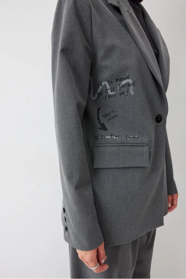 Жакет прямого силуэта из костюмной ткани. Воротник пиджачного типа с центральной застежкой на петлю и пуговицу. Рукав втачной двухшовный с декоративной шлицей и пуговицами. По переду и спинке талиевые вытачки. По переду карман с клапаном. По переду и спинке дизайнерская печать. Жакет на подкладке. Обращаем ваше внимание, что фурнитура может отличаться от фото.