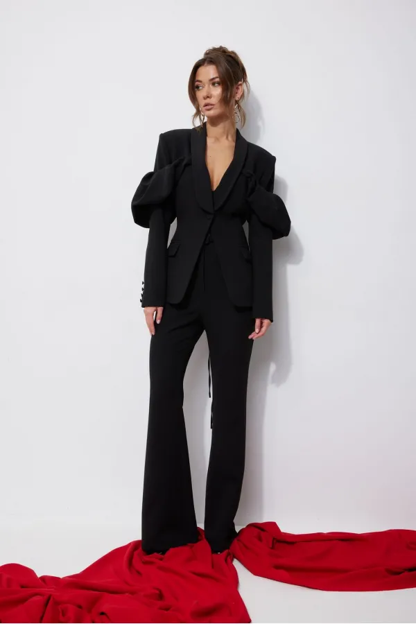 Жакет полуприлегающего силуэта из костюмной ткани. Жакет с V- образным вырезом и воротником, с застежкой по центру на петлю и пуговицу. Рукав втачной двухшовный, по низу декоративная шлица с пуговицами. По переду рельефы, талиевые вытачки и функциональные карманы с клапанами. На спинке декоративный элемент для регулирования степени прилегания изделия. В комплект входит съемная деталь. Обращаем ваше внимание, что фурнитура может отличаться от фото.