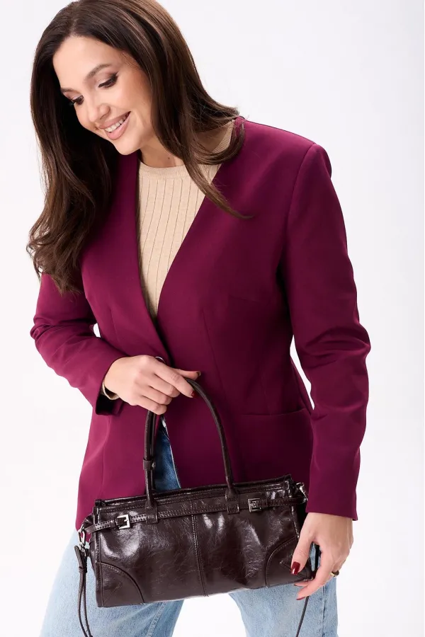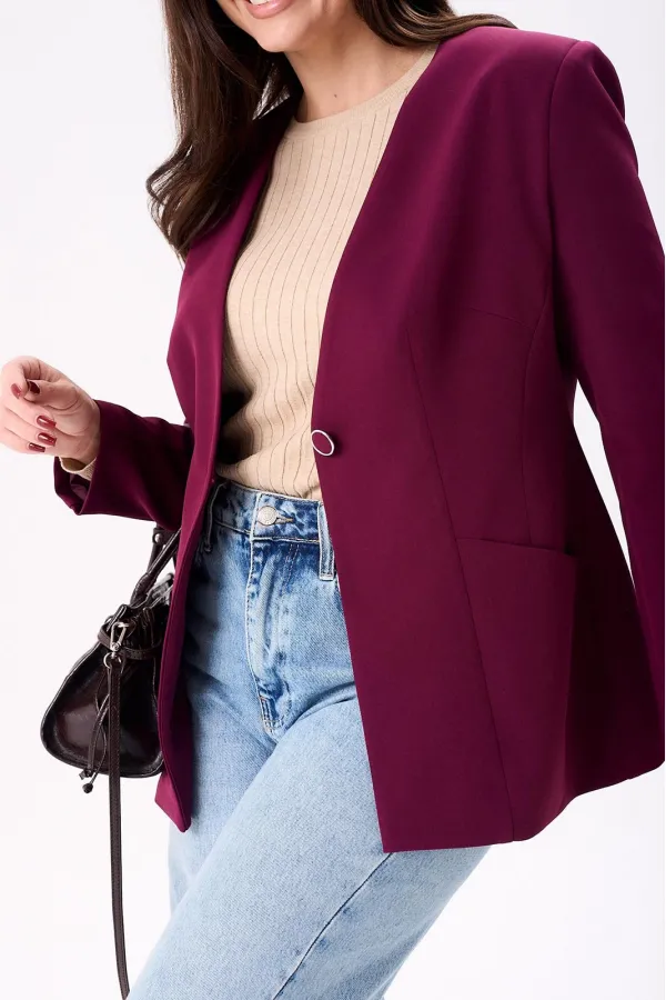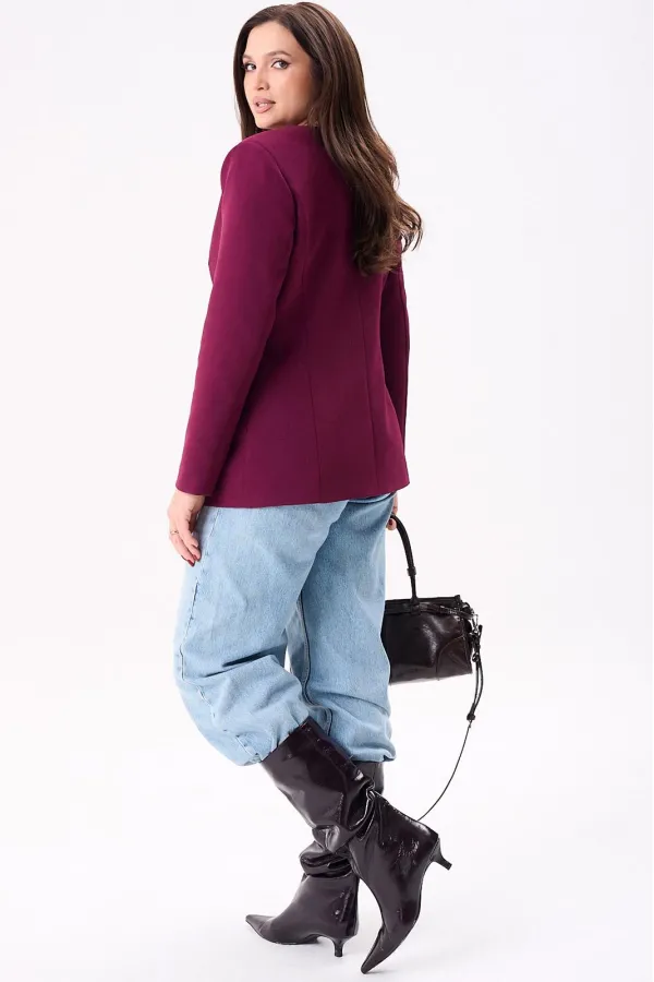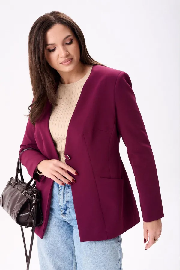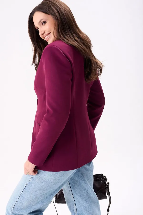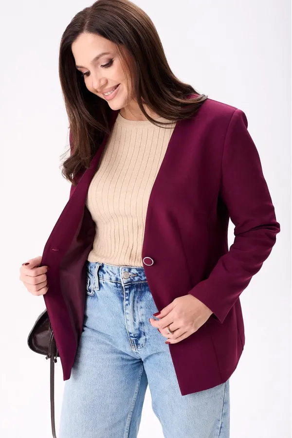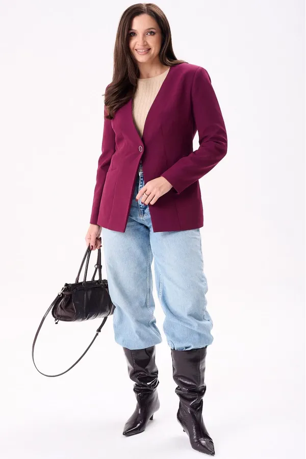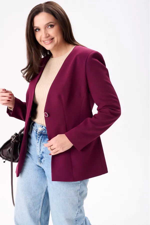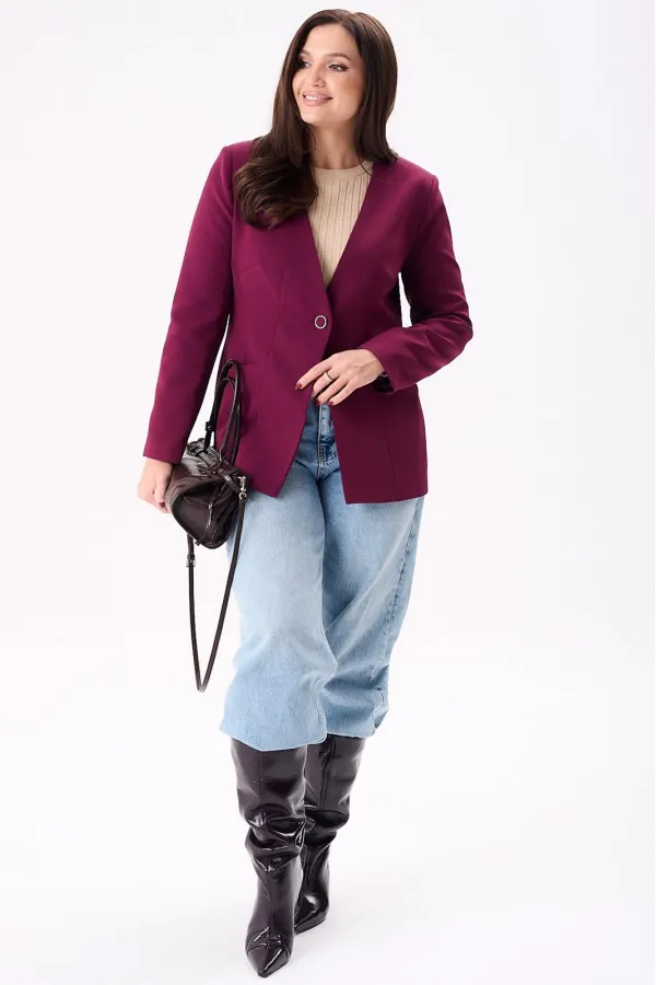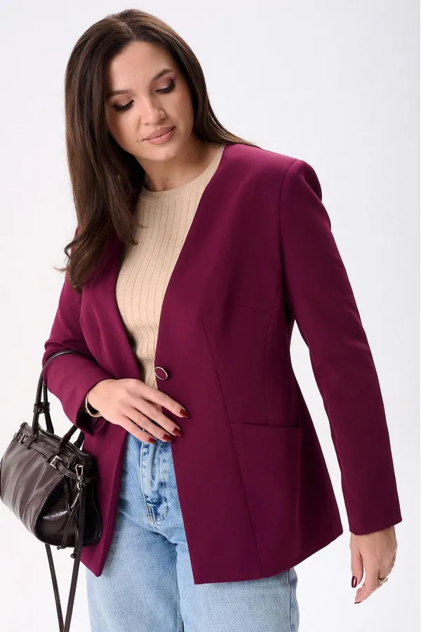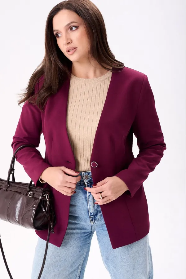 Жакет женский полуприлегающего силуэта на подкладке, застёгивается на одну петлю и пуговицу. По переду нагрудные и талевые вытачки, боковой подрез и втачные карманы, а по спинке центральный шов и рельефы. Рукава двух шовные втачные.