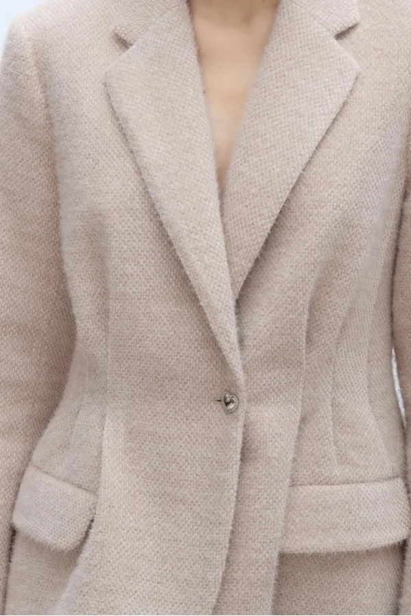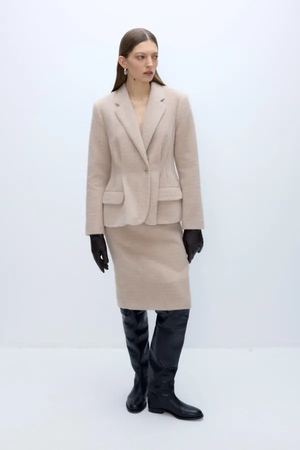 Приталенный жакет со складками из пушистой ткани. Детали: пиджачный воротник, перед с функциональными карманами, застежка на одну петлю и пуговицу, рукава втачные двухшовные, спинка с рельефами и резинкой по талии. Жакет... Читать далее...