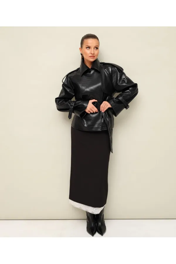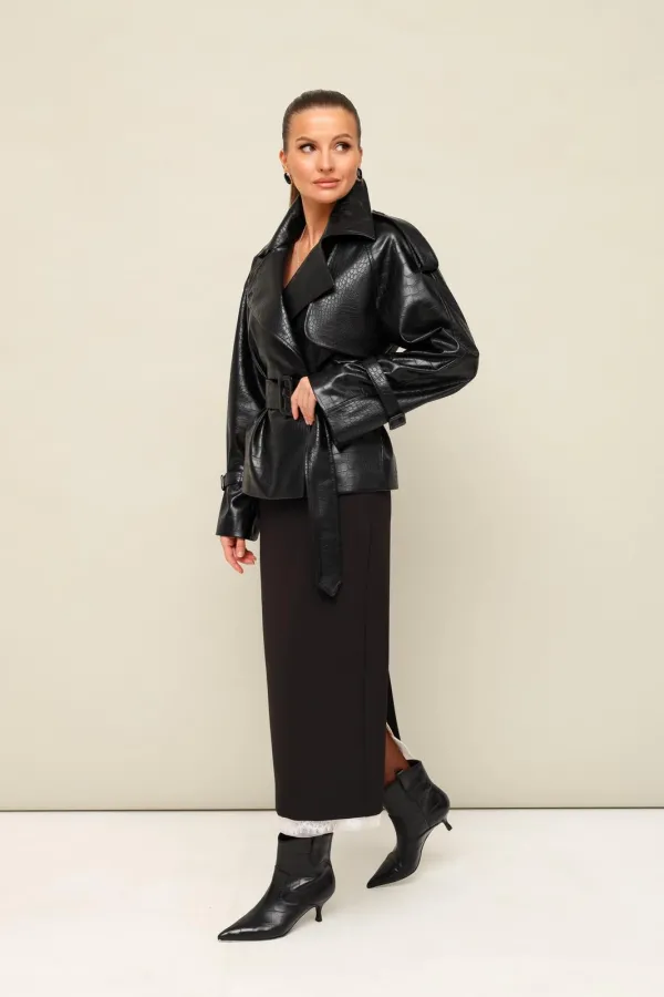 Жакет современного прямого силуэта, двубортный с застежкой на петли и пуговицы. По плечевому шву обработаны погоны. Воротник пиджачного типа с отложными лацканами. Спереди отлетная кокетка. Рукава кроя реглан, с патами по низу, с фиксацией на пряжки. Спинка со средним швом. Изделие на подкладке. В комплекте пояс из основной ткани с пряжкой.