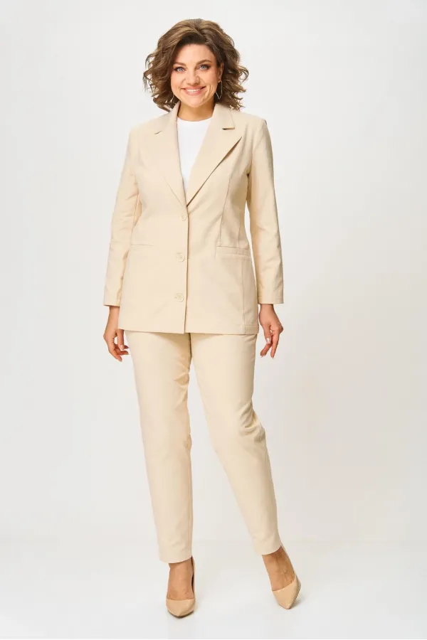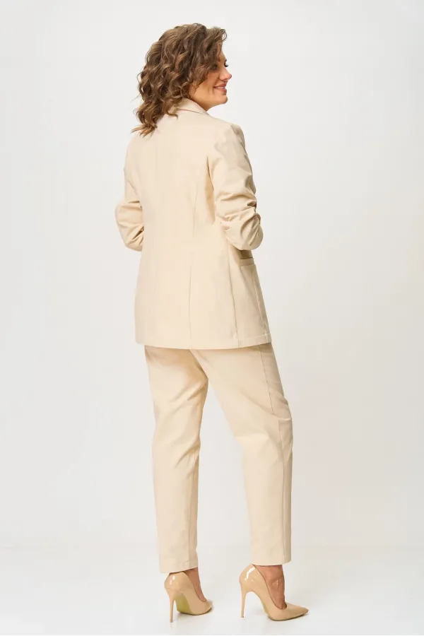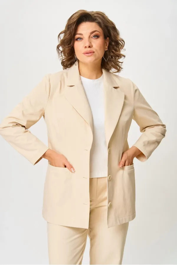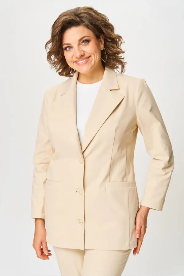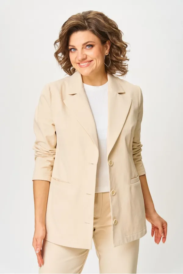 Спинка жакета со средним швом и рельефом. Рукав двухшовный, втачной. Воротник и подборта пиджачного типа.