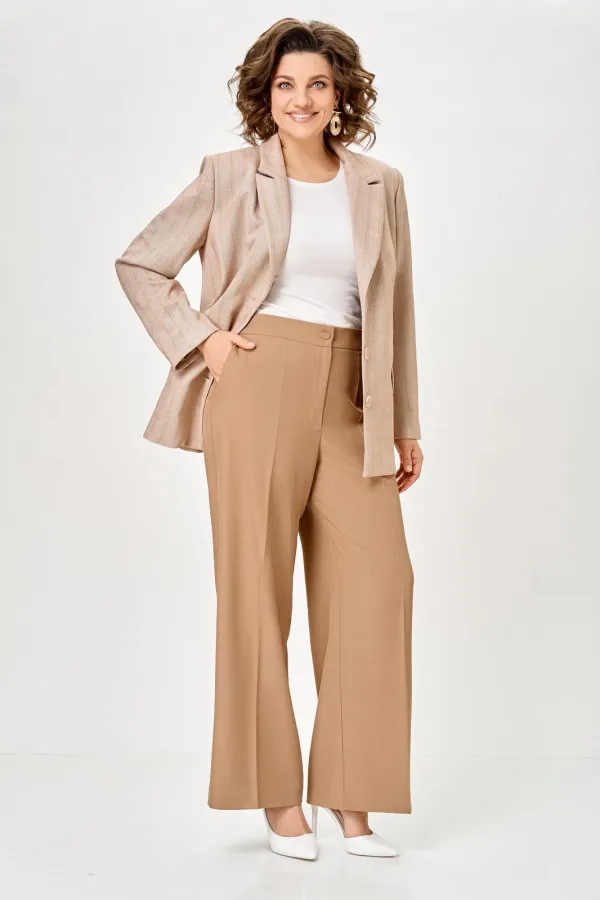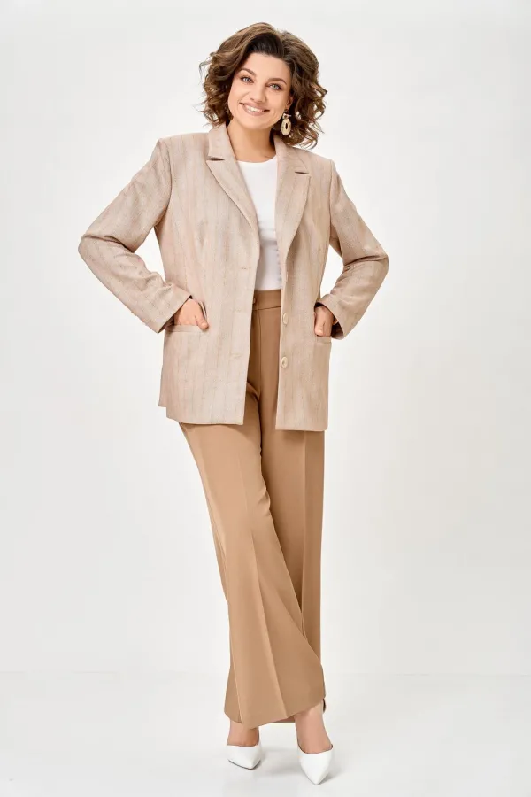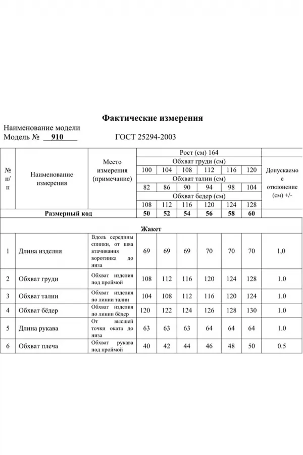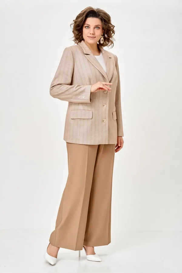 Жакет женский с трикотажной костюмной ткани, полуприлегающего силуэта, с центральной бортовой застежкой на три прорезные петли и три пуговицы; на притачной по низу изделия подкладке. Полочки - с отложными лацканами закруглённой формы; с вертикальными рельефами, идущими от проймы до низа; с вертикальными вытачками, идущими от груди до кармана; с прорезными карманами с клапаном и обтачкой; с прямыми бортами по линии низа. Спинка - со средним швом; с двумя рельефами, идущими от проймы до низа. Рукава - втачные, двухшовные, длинные, с имитацией шлицы декорированной двумя пуговицами. Воротник - втачной, отложной, на притачной стойке. Длина рукава 63 см. (+/-1) см