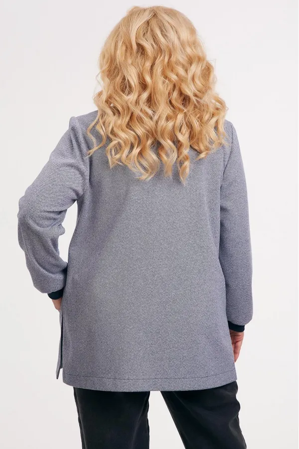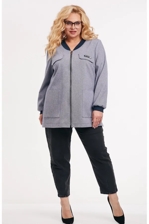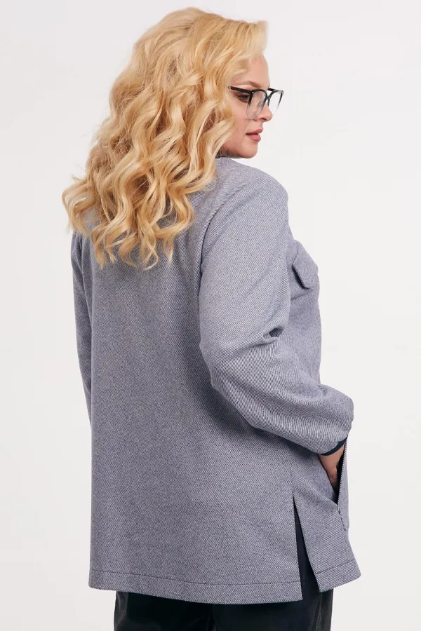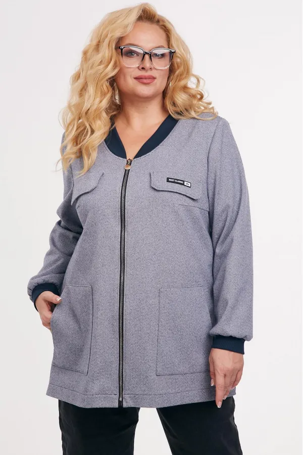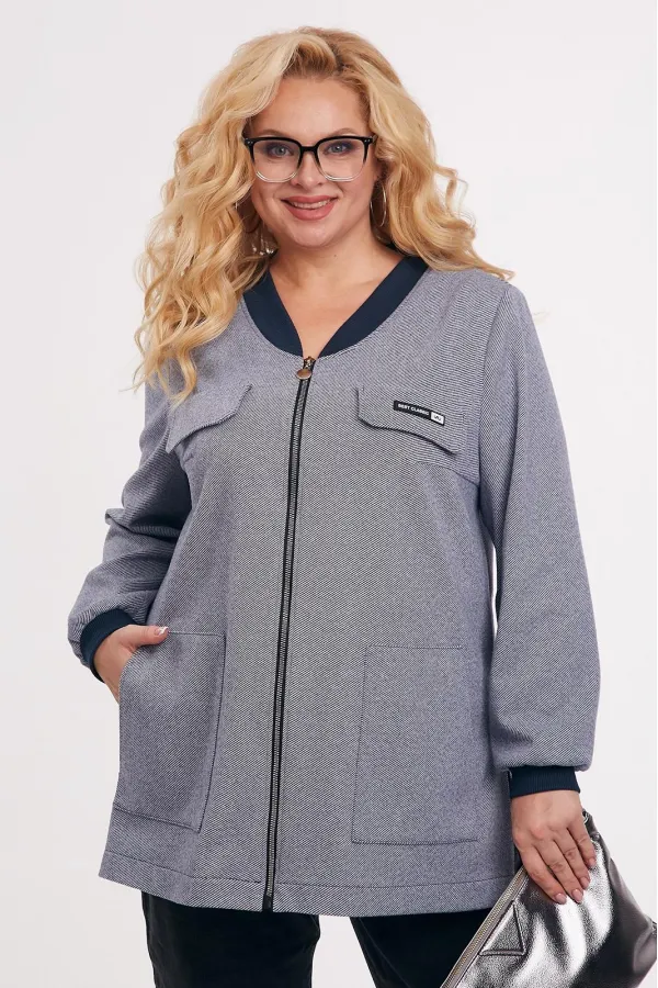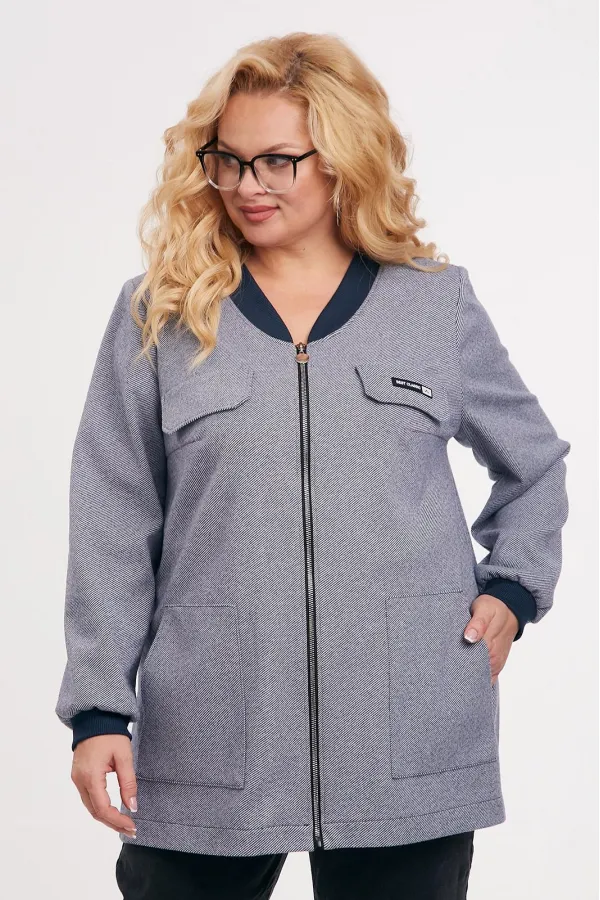 Жакет прямого силуэта с застёжкой на молнию. Перед с нагрудными вытачками, декоративными клапанами, накладными карманами. Спинка цельная. Рукав втачной, длинный, снизу присобран на манжету из довяза. Горловина обработана воротником-стойкой из довяза в стиле бомбера, что придаёт образу современный спортивный акцент. Небольшие боковые разрезы добавляют комфорта и делают силуэт более лёгким.