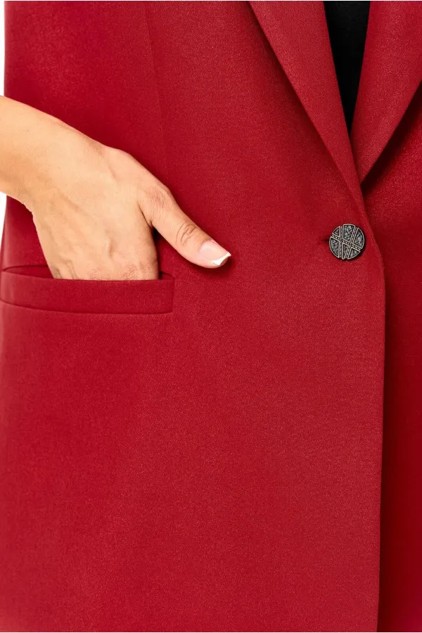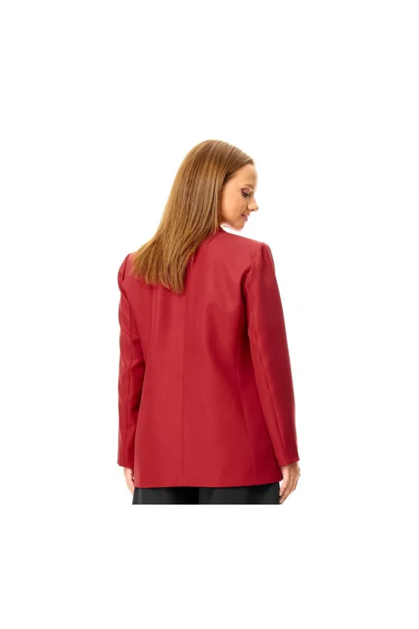 Свободный жакет с воротником и лацканами, застегивается на петли и пуговицы, с прорезными карманами по переду. Рукав длинный. Жакет перед и спинка на подкладке.
