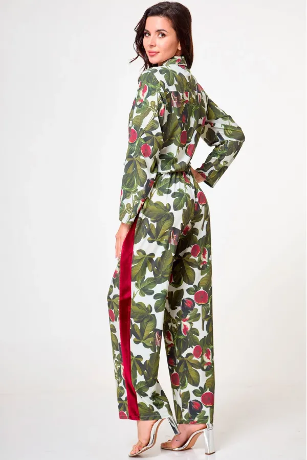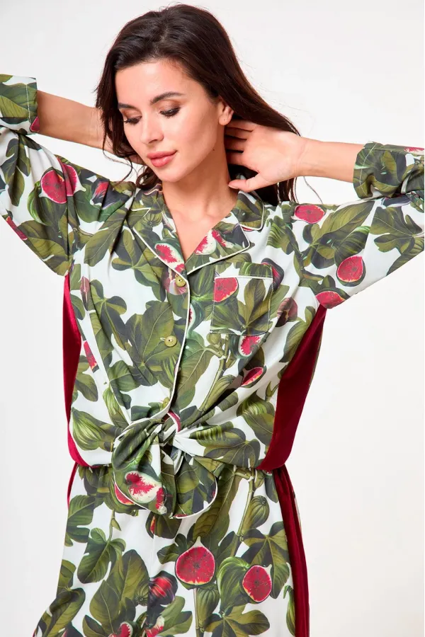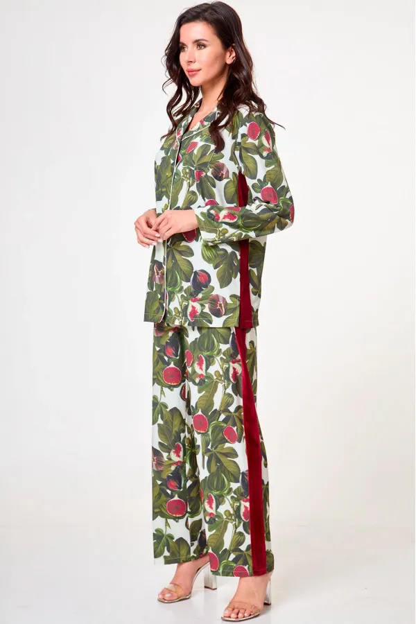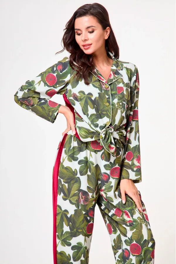 Классическая пижама с бархатными лампасами по боковым швам и актуальным принтом. Предназначена не только для дома, но и для смелых модниц для повседневной носки. В ней вам будет невероятно комфортно, как на работе, так и во время прогулки /свидания. Верх длиной до бедра, с классическим воротником, по краю декорирован кантом, застежка на петли пуговицы. На левой половинке переда нагрудный карман. Рукав длинный.