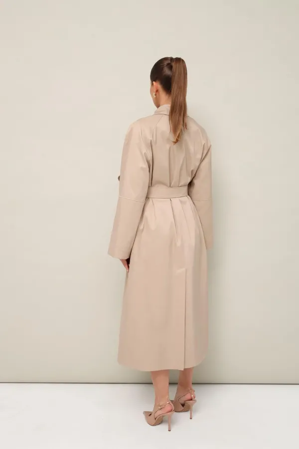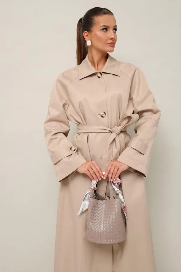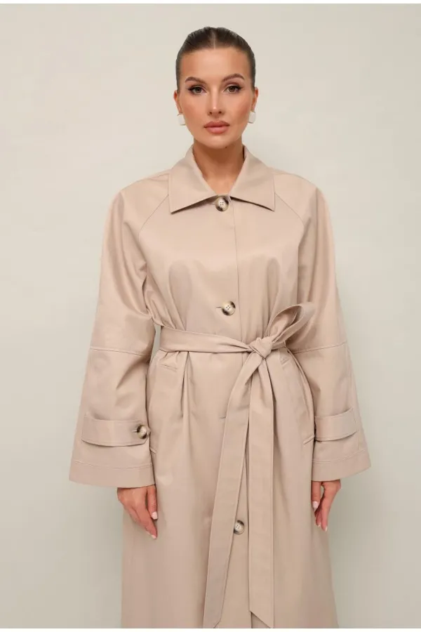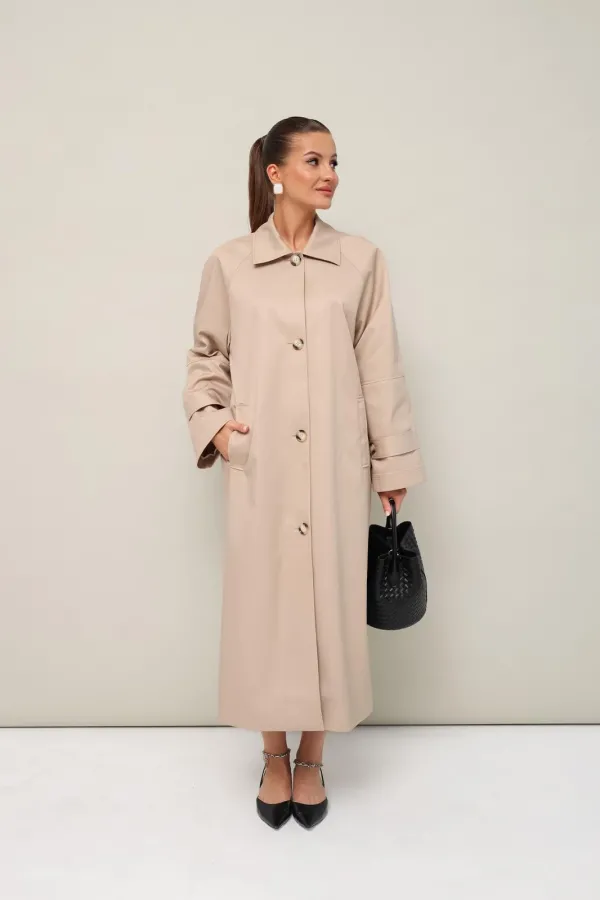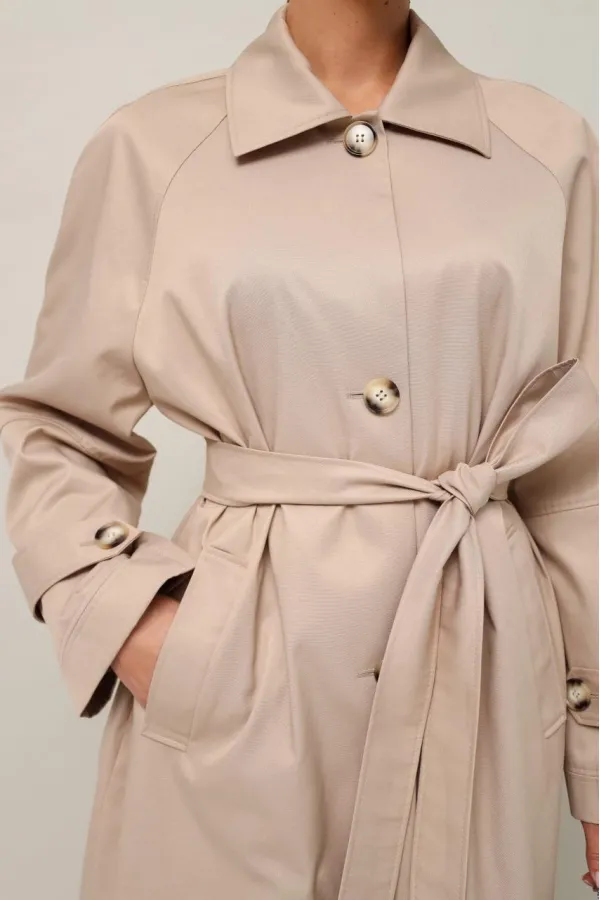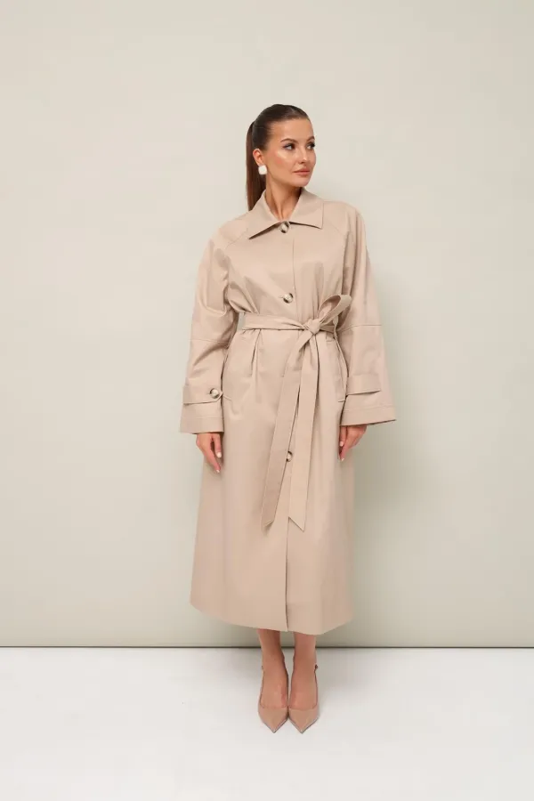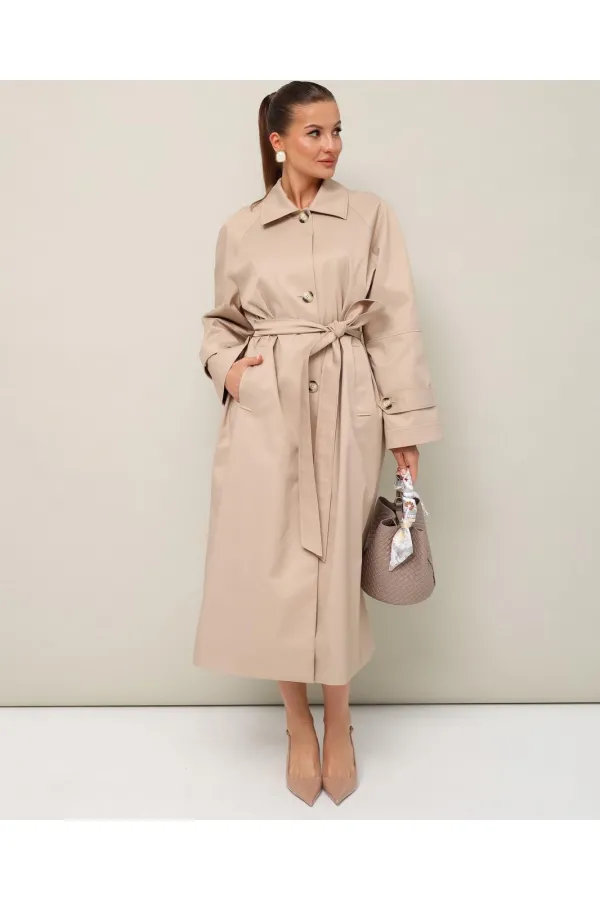 Плащ в длине миди, выполнен из ткани с водоотталкивающей и грязеотталкивающей обработкой. Силуэт слегка расширенный к низу. Отложной воротник с цельнокроеной стойкой. Центральная застёжка на петли и пуговицы. Спереди функциональные карманы-листочки. Рукава кроя реглан, по низу обработаны паты с застежкой на пуговицы. Спинка со средним швом со шлицей по низу. Плащ на подкладке. В комплекте прилагается пояс из основной ткани.