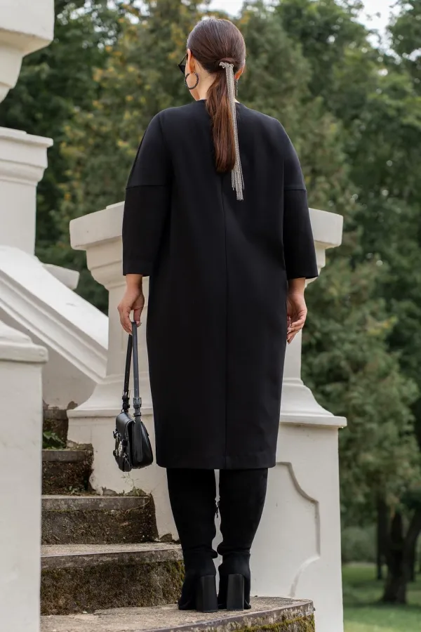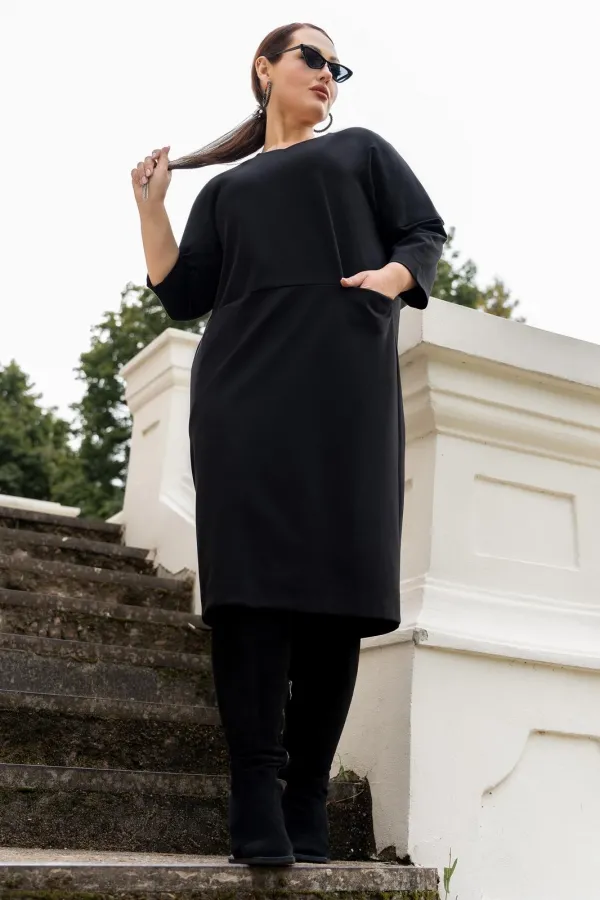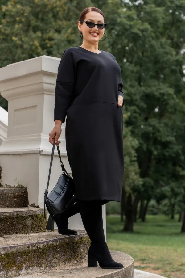 Платье выполнено из премиуального трикотажа, свободного силуэта,с V-образным вырезом горловины, со спущеным плечом, рукава 7/8. по полочке горизонтальный подрез в котром обработаны карманы. Спинка со средним швом. Горловина обработана бейкой.