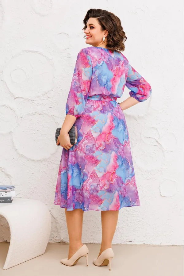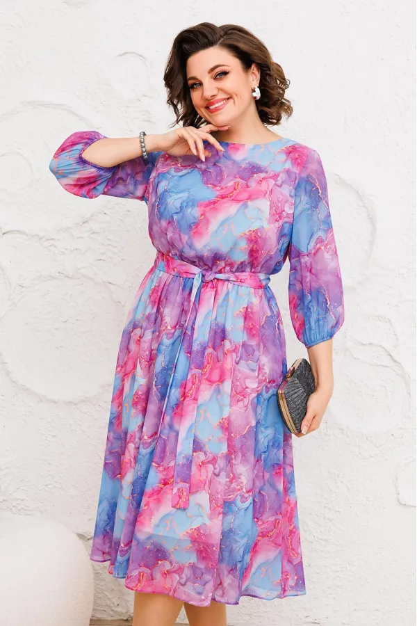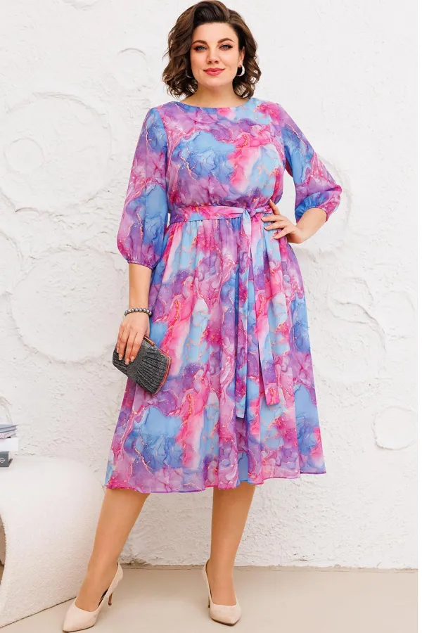 Роскошное женское платье полуприлегающего силуэта, расширенное к низу, выполнено из высококачественного шифона с модным дизайнерским принтом. Платье отрезное по талии со сборкой на резинке, полностью на трикотажной подкладке. Вырез горловины округлый, на обтачке. Рукава втачные, по низу собраны на узкую резинку. В комплект входит пояс из основной ткани. Модель платья удобная и практичная, прекрасно подойдет для ежедневной носки, а также для торжественного мероприятия.