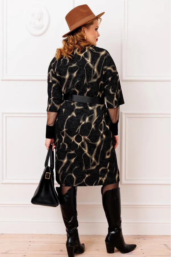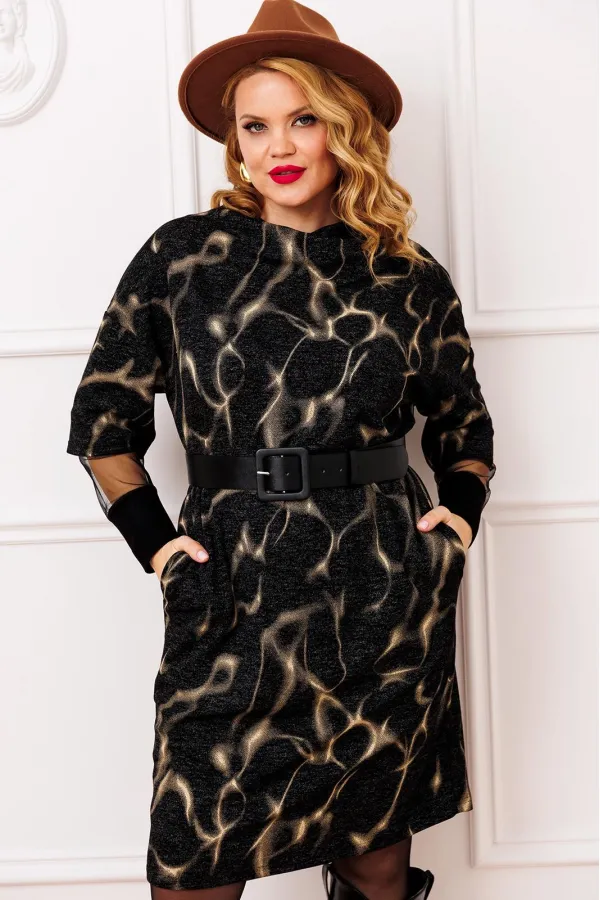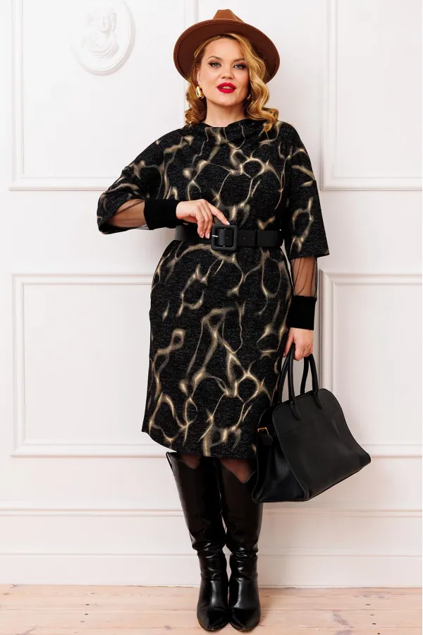 Стильное женское платье прямого силуэта, выполнено из высококачественной трикотажной ткани с модным дизайнерским принтом (ткань мягкая, приятная к телу, хорошо тянется). Горловина хомут, рукав спущенный, с отделкой из сетки с манжетой из трикотажного довяза, в боковых швах функциональные карманы. В комплекте идет съемный кожаный пояс. Модель стильная и практичная, невероятно стройнит, прекрасно подойдет для ежедневной носки, вы будете выглядеть неотразимо.