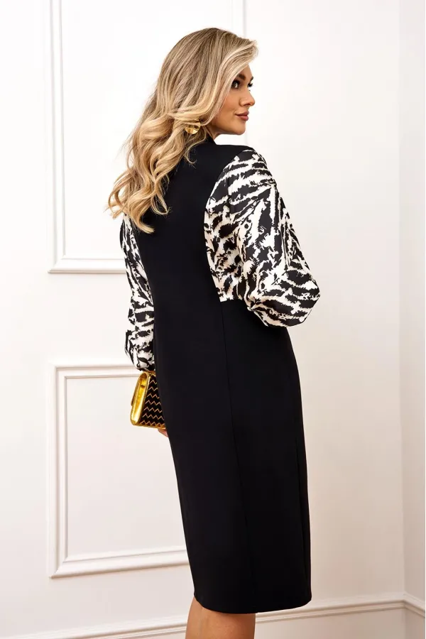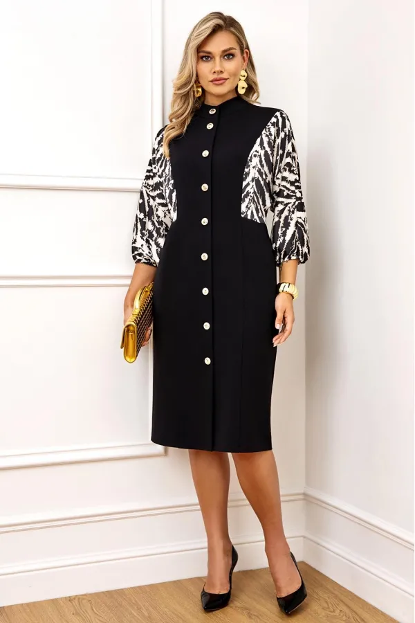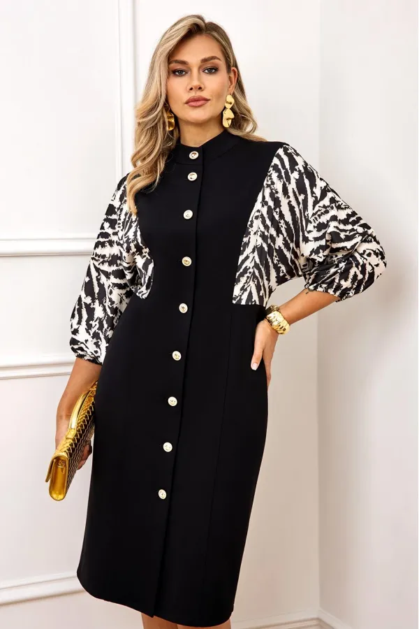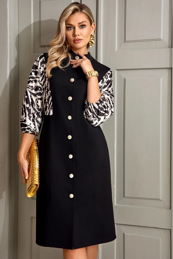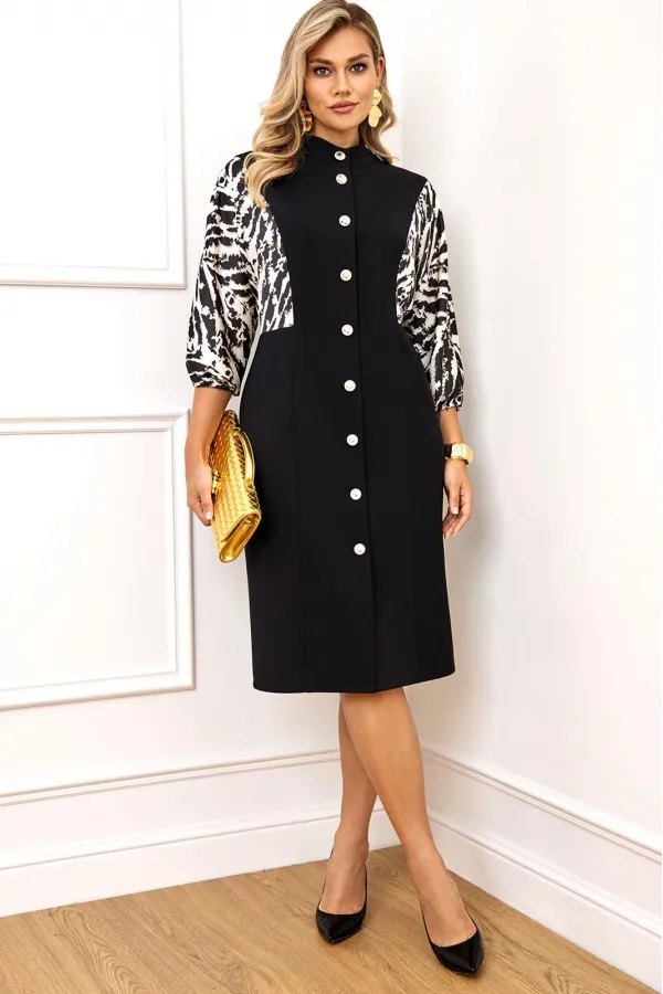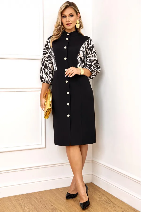 Стильное женское платье, выполнено из высококачественного трикотажа, рукава платья выполнены из атласной ткани с модным дизайнерским принтом, в стиле летучая мышь, по низу рукав на резинке. Платье с застежкой по переду на пуговицы, с горловиной стойкой, что придает модели особый стиль и шарм. Модель удобная и практичная, отлично подойдет для ежедневной носки и торжественного мероприятия.