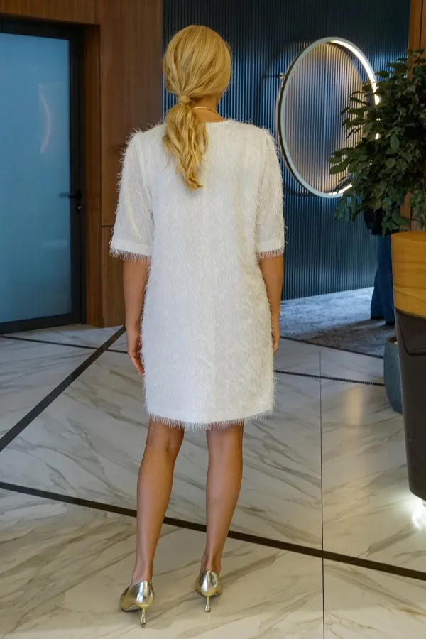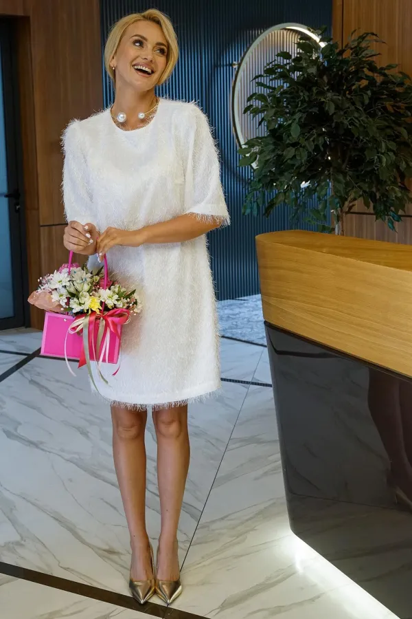 Платье А- образного силуэта, на подкладке. Перед с нагрудными выточками. Спинка со средним швом с разрезом и застёжкой на навесную петлю и пуговицу. Рукава втачные, одношовные, короткие.