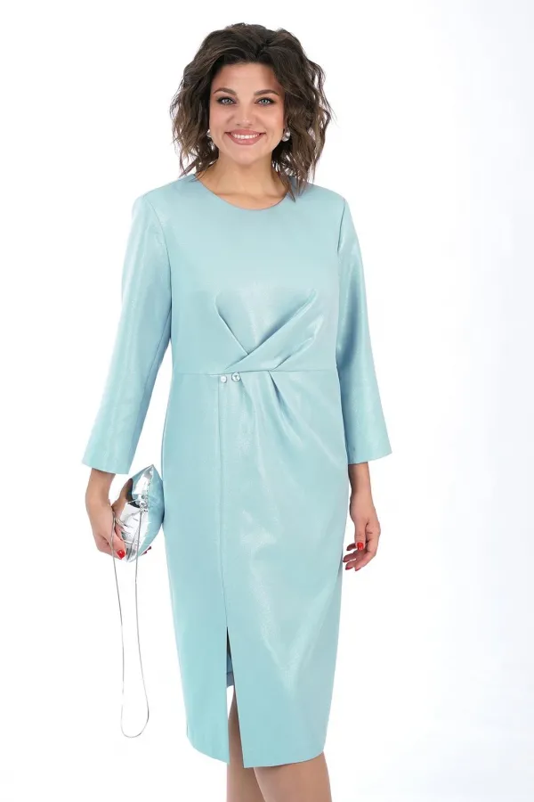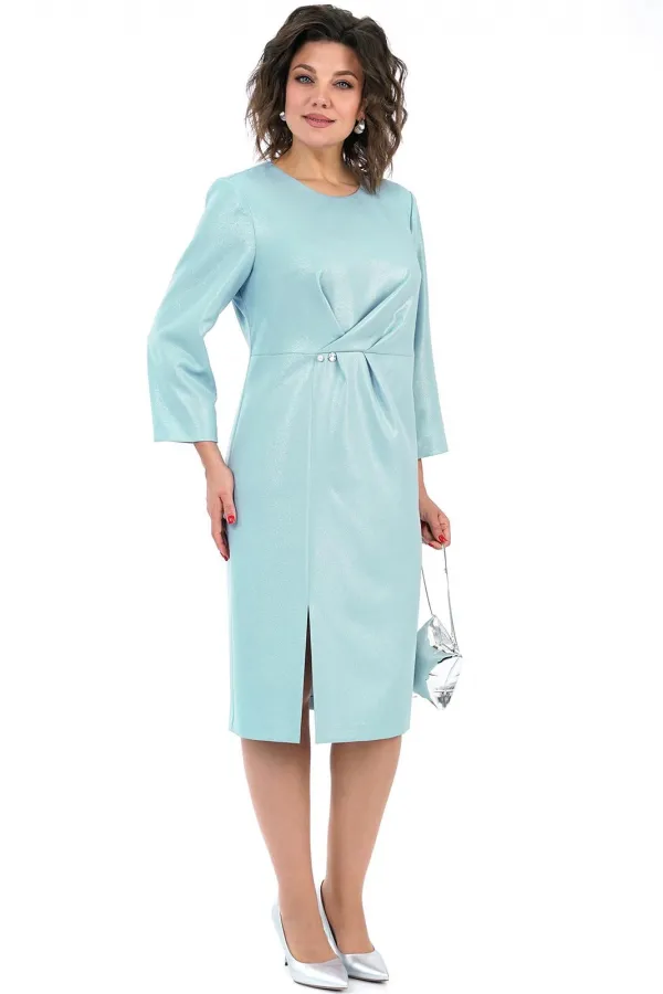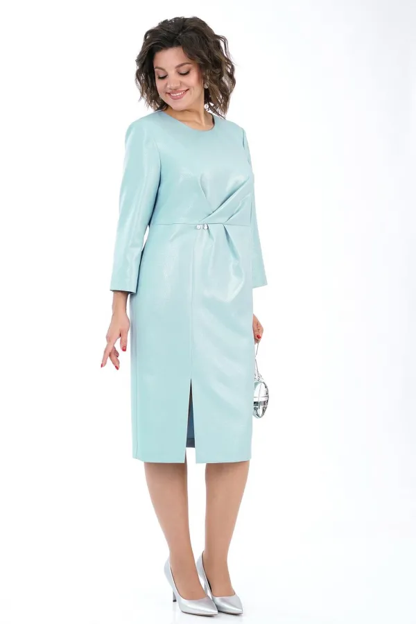 Платье полуприлегающего силуэта, на подкладке, с застёжкой на потайную молнию в среднем шве спинки. Перед отрезной по линии талии, по шву с мягкими складками декорированный съёмным украшением. Нижняя часть по правой стороне с рельефным швом заканчивающийся разрезом. Спинка с талевыми выточками. Рукава втачные, двухшовные, длиной ¾.