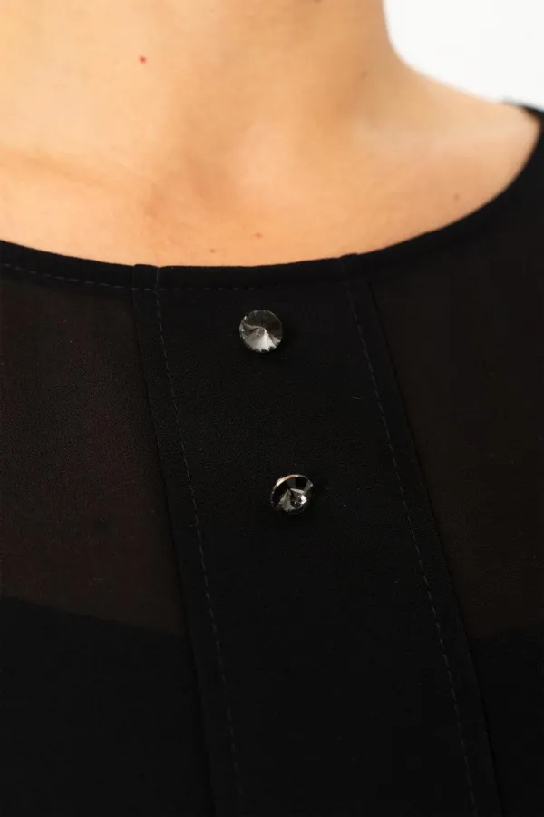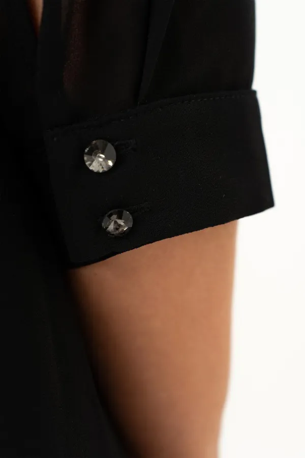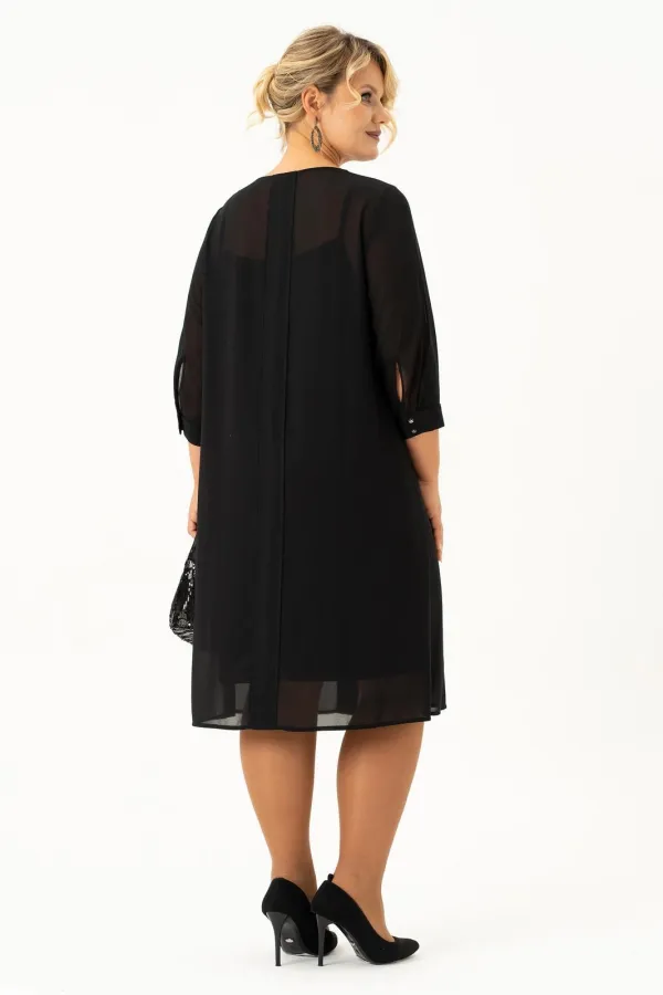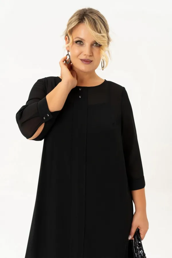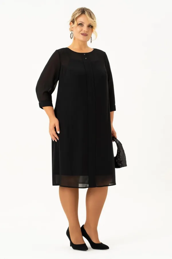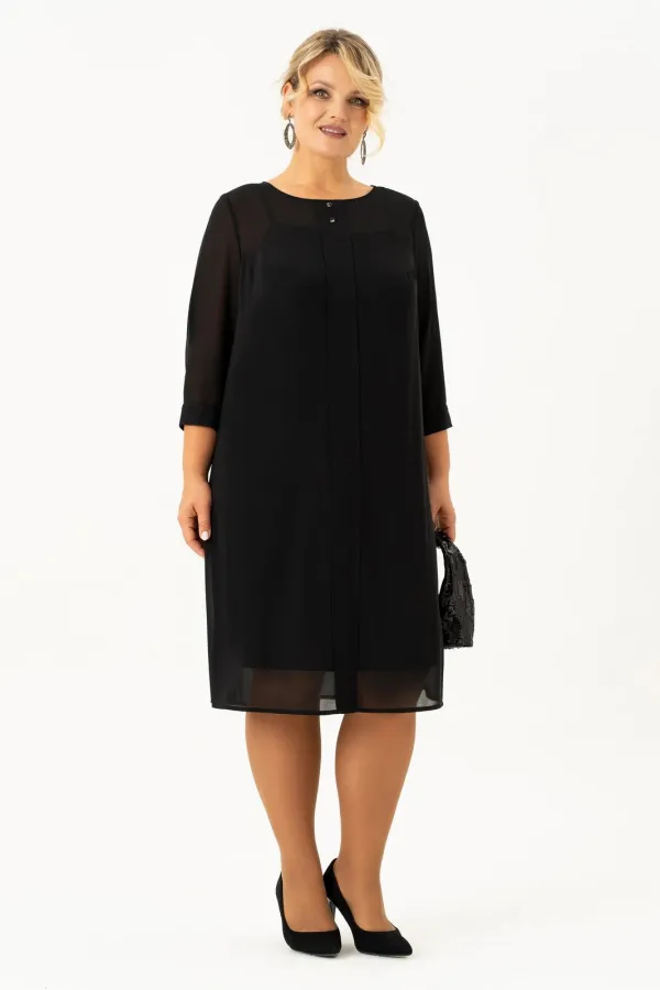 Нарядно повседневное, универсальное, элегантное черное платье с рукавом длиной ¾ на манжете и отдельным подкладом поможет Вам в создании абсолютно разных образов. Платье имеет классический прямой крой с бантовыми складками по переду и по спинке, которые добавляют романтичность и элегантность. Платье подойдет как высоким, так и невысоким женщинам, благодаря своей миди длине. Верхнее платье выполнено из шифона, горловина декорирована пуговицами. Нижнее платье из ткани масло на бретелях. Это платье Вы можете легко использовать как вечернее, платье для прогулки или на свидание, на день рождения или клуб, для фотосессии или романтического вечера. Такое платье будет уместно в любом гардеробе.