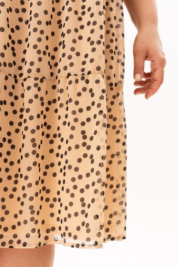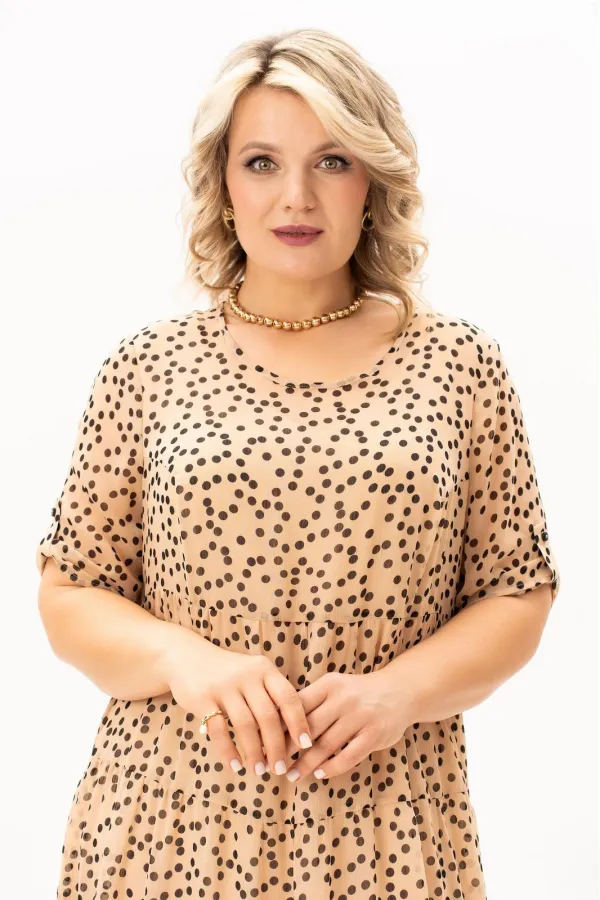 Великолепное шифоновое платье в горошек, в три яруса воланов, собранных на сборку - хит всех сезонов. Эта стильная и оригинальная деталь гардероба поможет сакцентировать внимание на красивой фигуре, скрыть недостатки нестандартной комплекции и сделать ее более изящной. Универсальное и практичное шифоновое платье свободного силуэта, длиной чуть ниже колена. На переде платья есть нагрудные вытачки. Вырез горловины круглый. Рукав втачной, декорирован патой на петлю и пуговицу. Платье на подкладке. Модное платье непременно поможет создать нужное настроение с нотками лёгкости и беззаботности. Платье актуально как свадьбу, день рождения, выпускной, так и просто прогуляться по набережной!
