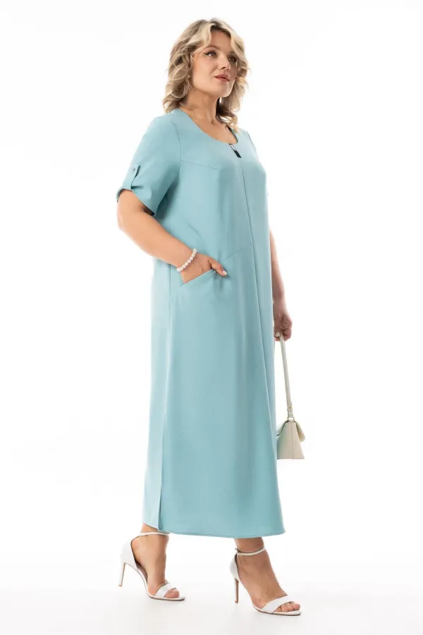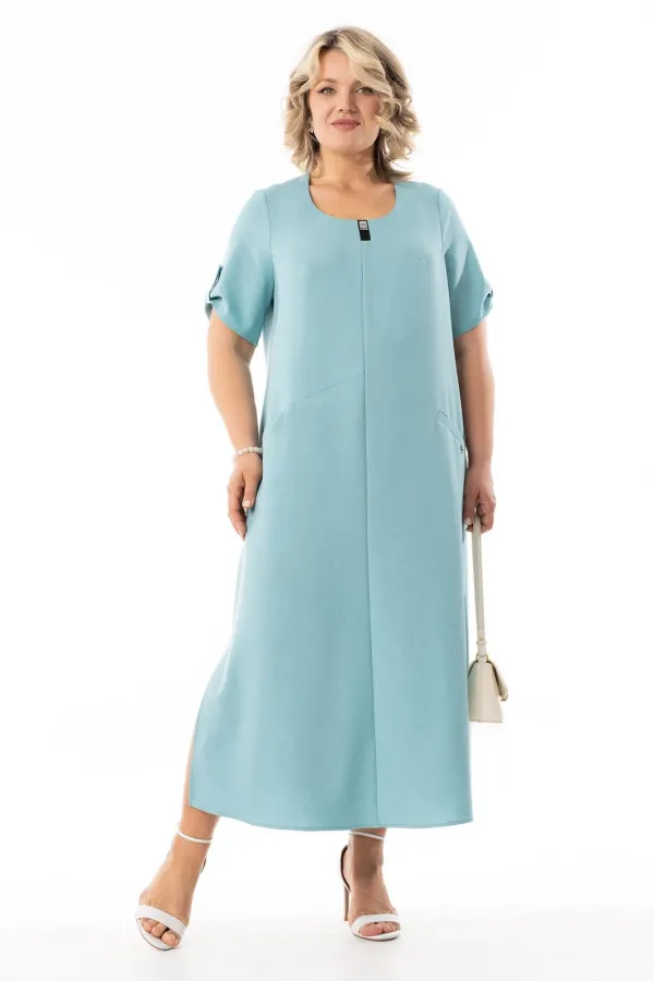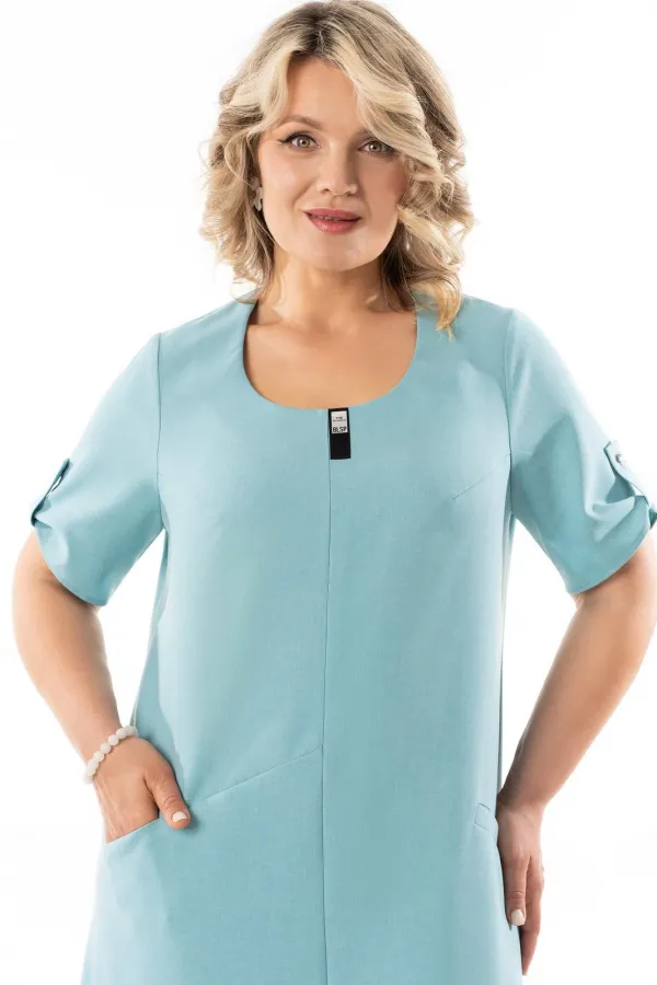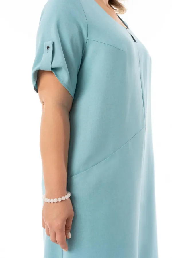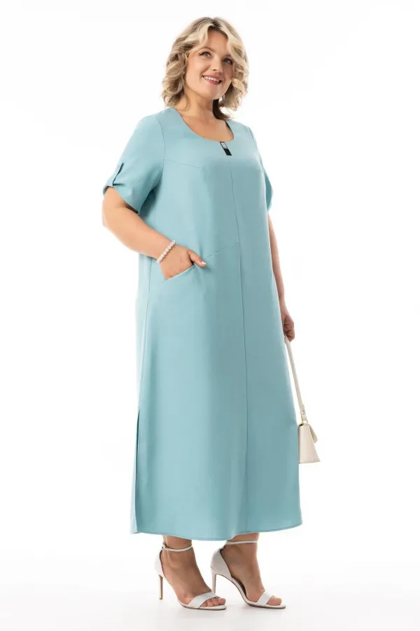 Комфортное летнее платье А-силуэта из плательной ткани лен-вишер смотрится очень оригинально и интересно. Платье из дышащего материала лен вишер идеально подойдет для полных женщин. Асимметричный перед со средним швом и диагональными подрезами в области бедер гармонично фрагментируют фигуру и наполняют образ легкостью. В боковых швах есть разрезы и функциональные карманы. Нагрудные вытачки создают прилегание в области груди. Спинка со средним швом, рукав короткий, с патой и пуговицей. Модель украшена изящной нашивкой. Элегантное и классическое платье легко комбинировать, позволяя создать и деловой стиль, и вечерний образ для девушек и женщин всех возрастов. Платье станет отличным выбором для учителей на последний звонок или даже на день рождения. Удобный крой и стильный дизайн делают его идеальным для пышных дам, на все праздники, а также для вечерних прогулок.