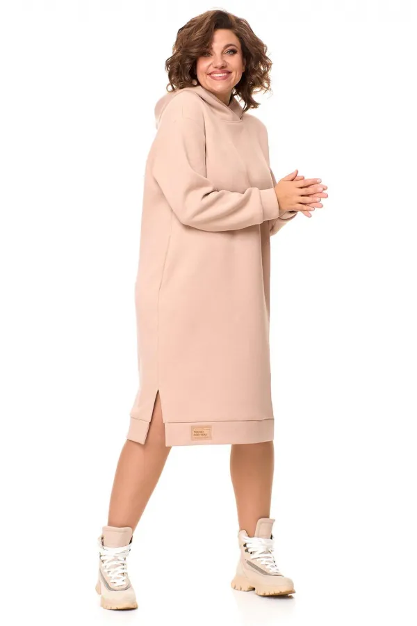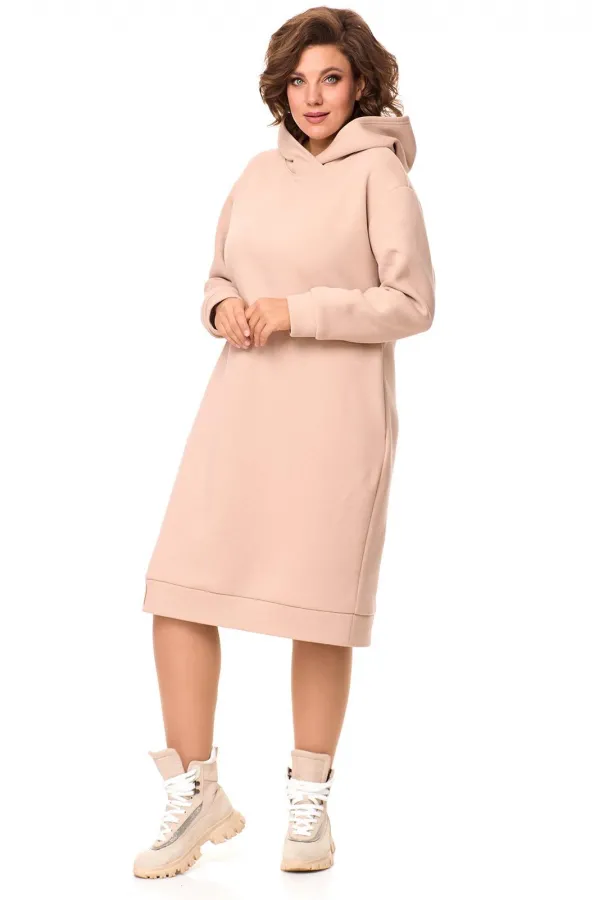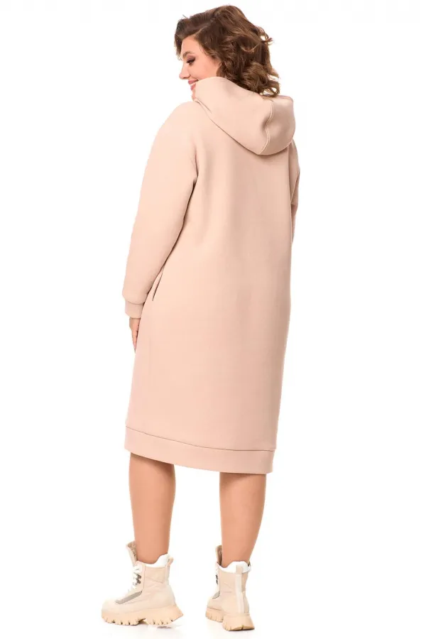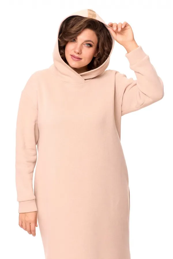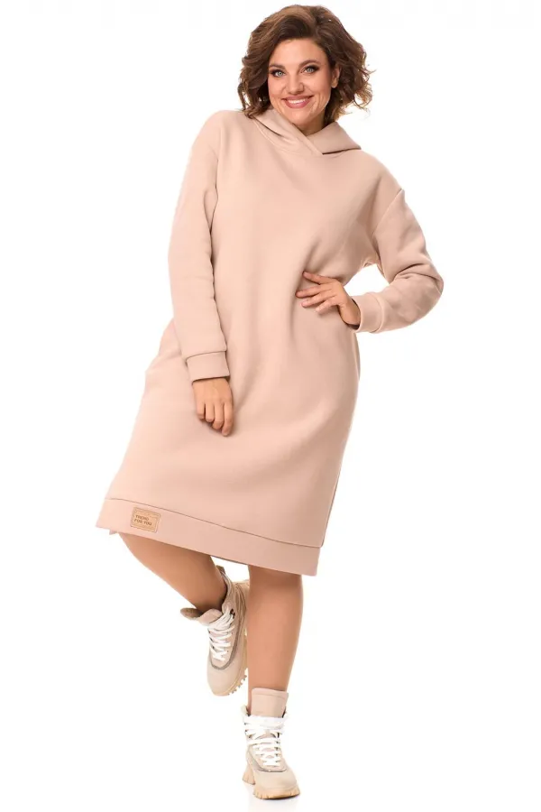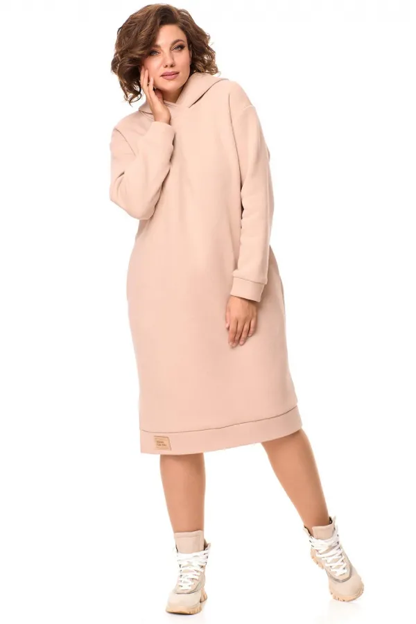Очень теплое женское платье из футера с начесом , прямого силуэта длиной за колено. Рукав со спущенным плечом на манжете. По низу платья идет отрезной пояс с декоративной нашивкой, сбоку разрез. По бокам - карманы. По горловине - двойной капюшон. Данная модель прекрасная покупка на зимний сезон. Длина платья по спинке: (50-54)-103 см., (56-60)-106 см. Длина рукава с манжетой: (50-54)-55 см., (56-60)-57 см.
