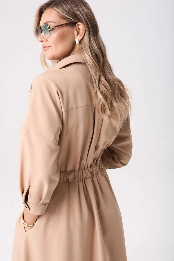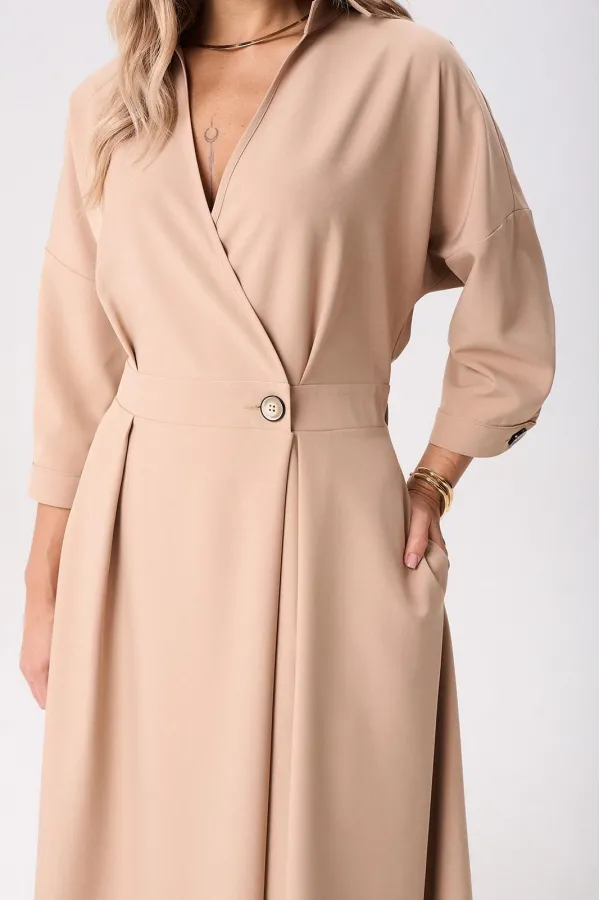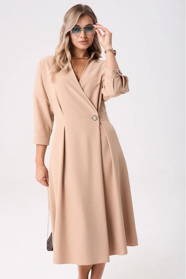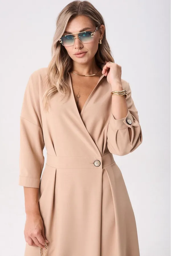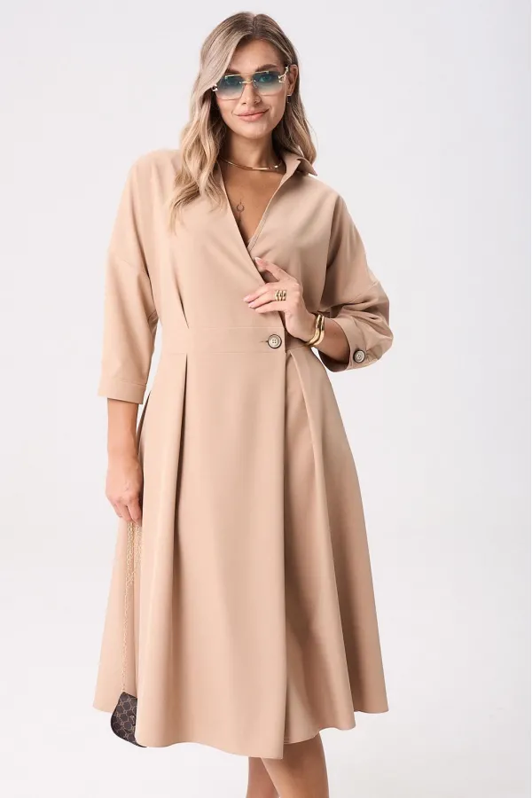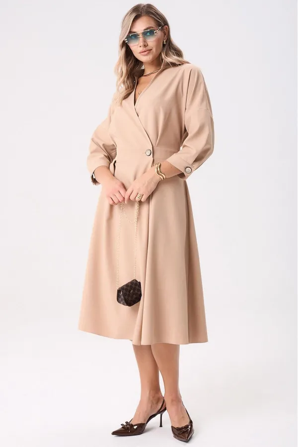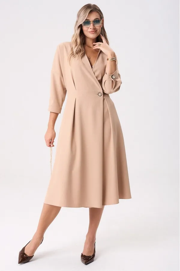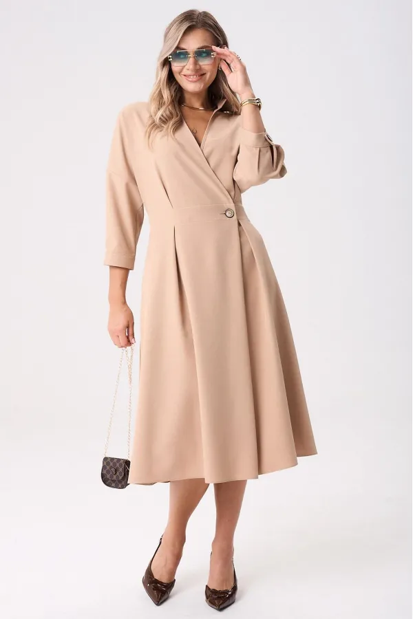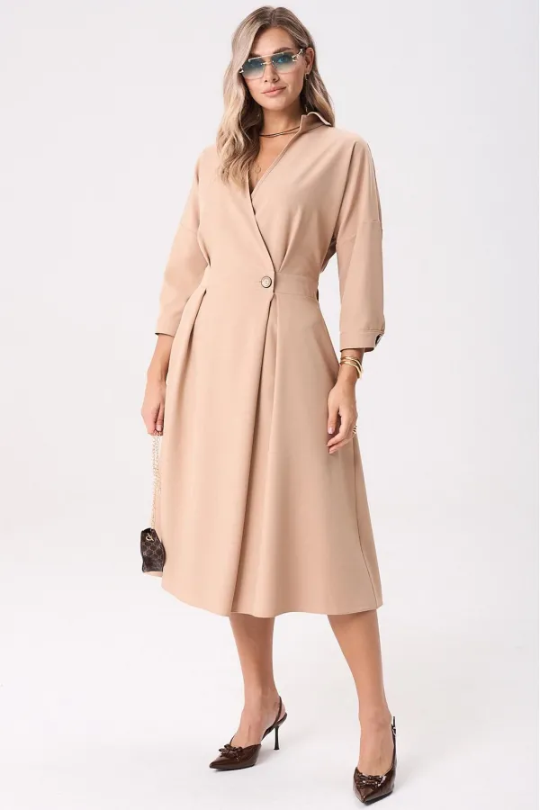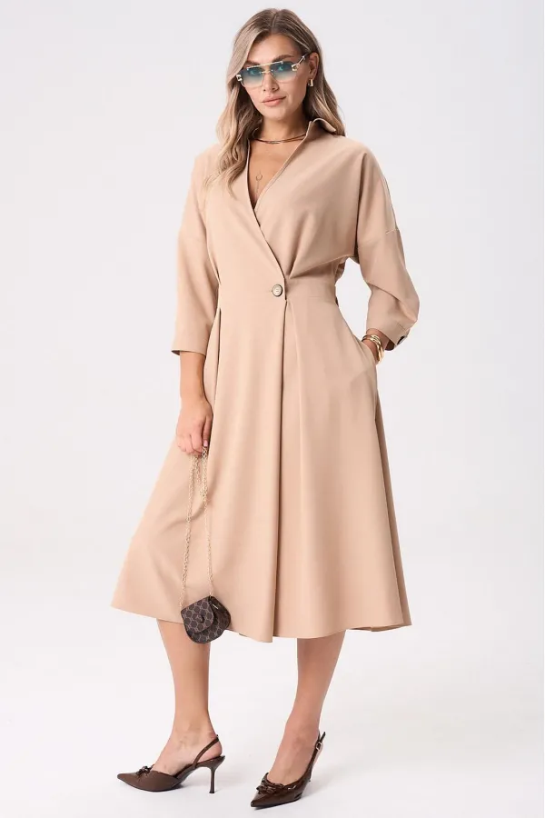 Элегантное женское палтье из костюмной ткани необычного кроя станет изюминкой вашего гардероба. Платье полуприлегающего силуэта, отрезное по линии талии со спущенным плечом. Рукав 3/4 длиный на отрезной манжете. По полочке идут защипы-складки в верхней и нижней частях, запах - на петли и пуговицы по подрезу. По нижней части платья запах идет в виде складки. По спинке кокетка со складкой, по подрезу вставлена резинка. Юбка-полусолнце с односторонними складками по полочке, по бокам карманы. По горловине воротник на отрезной стойке. Платье будет идеально смотреться с туфлями, ботинкаи и сапогами. Длина по спинке: 117см. Длина рукава с манжето 29см.