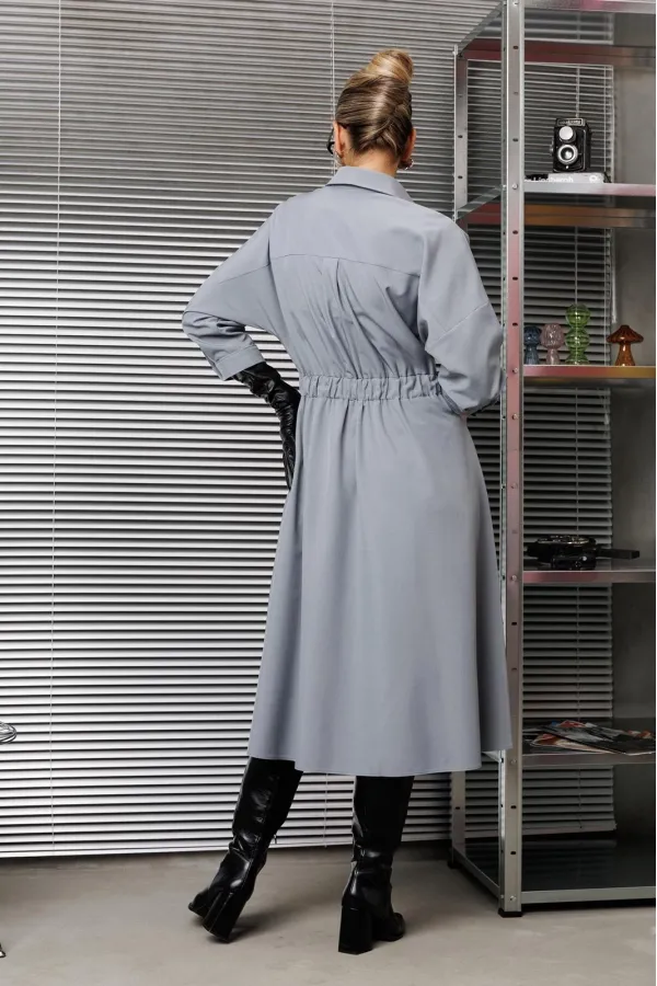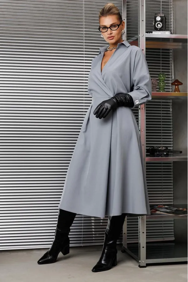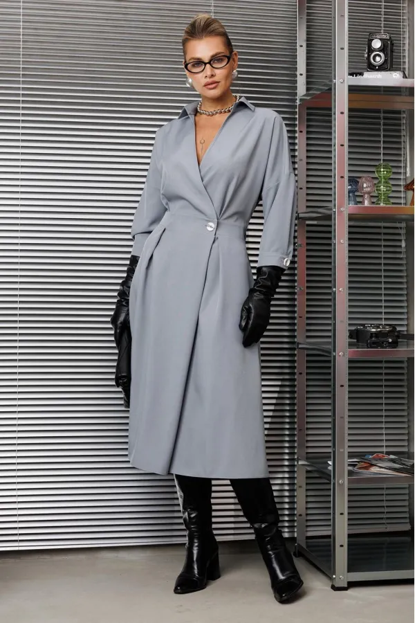 Элегантное женское палтье из костюмной ткани необычного кроя станет изюминкой вашего гардероба. Платье полуприлегающего силуэта, отрезное по линии талии со спущенным плечом. Рукав 3/4 длиный на отрезной манжете. По полочке идут защипы-складки в верхней и нижней частях, запах - на петли и пуговицы по подрезу. По нижней части платья запах идет в виде складки. По спинке кокетка со складкой, по подрезу вставлена резинка. Юбка-полусолнце с односторонними складками по полочке, по бокам карманы. По горловине воротник на отрезной стойке. Платье будет идеально смотреться с туфлями, ботинкаи и сапогами. Длина по спинке: 117см. Длина рукава с манжето 29см.